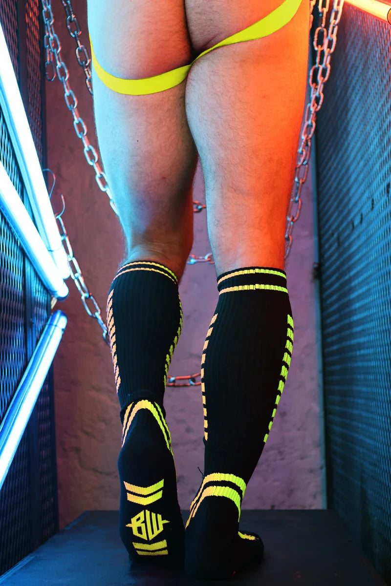 Everyone needs a little Vitamin D. And whether you get yours at the bathhouse or the beach, BREEDWELL is here to help you look your best. The new DAYCRAWLER SOCK has all the unique features of the entire BREEDWELL SOCK COLLECTION and matches up with all the DAYCRAWLER looks. So pull ‘em up, or wear ‘em low, just get yours before they sell out. Available in PURPLE, NEON PINK, NEON ORANGE and BLACK