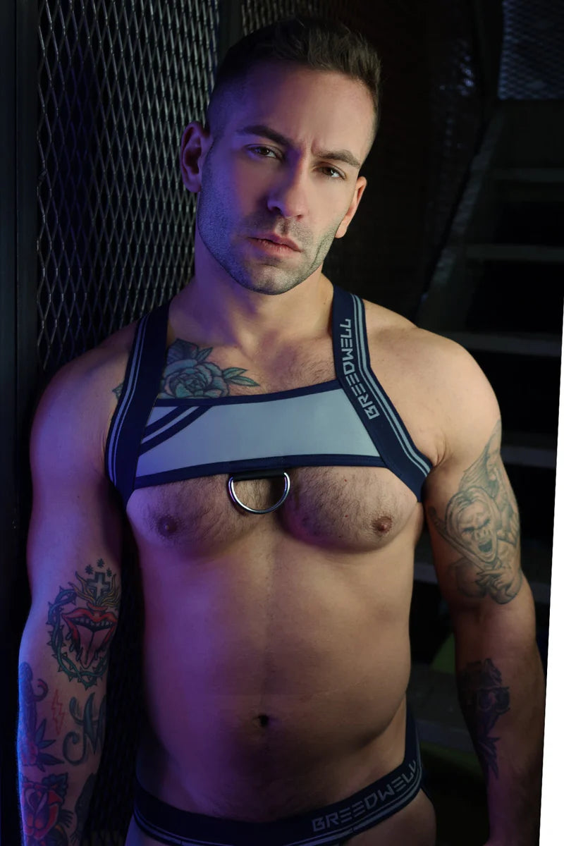 Our latest in neoprene the new NEO SPARK HARNESS has a unique pec-highlighting chest plate made of reflective heavy weight neoprene that changes color in different lights. It in silver or dark rainbow (it also catches any fluids that don't make it into your mouth). And, like all BREEDWELL HARNESSES, the NEO SPARK HARNESS has back sliders for a custom fits-like-a-glove feel and all of the signature logos and hardware.
