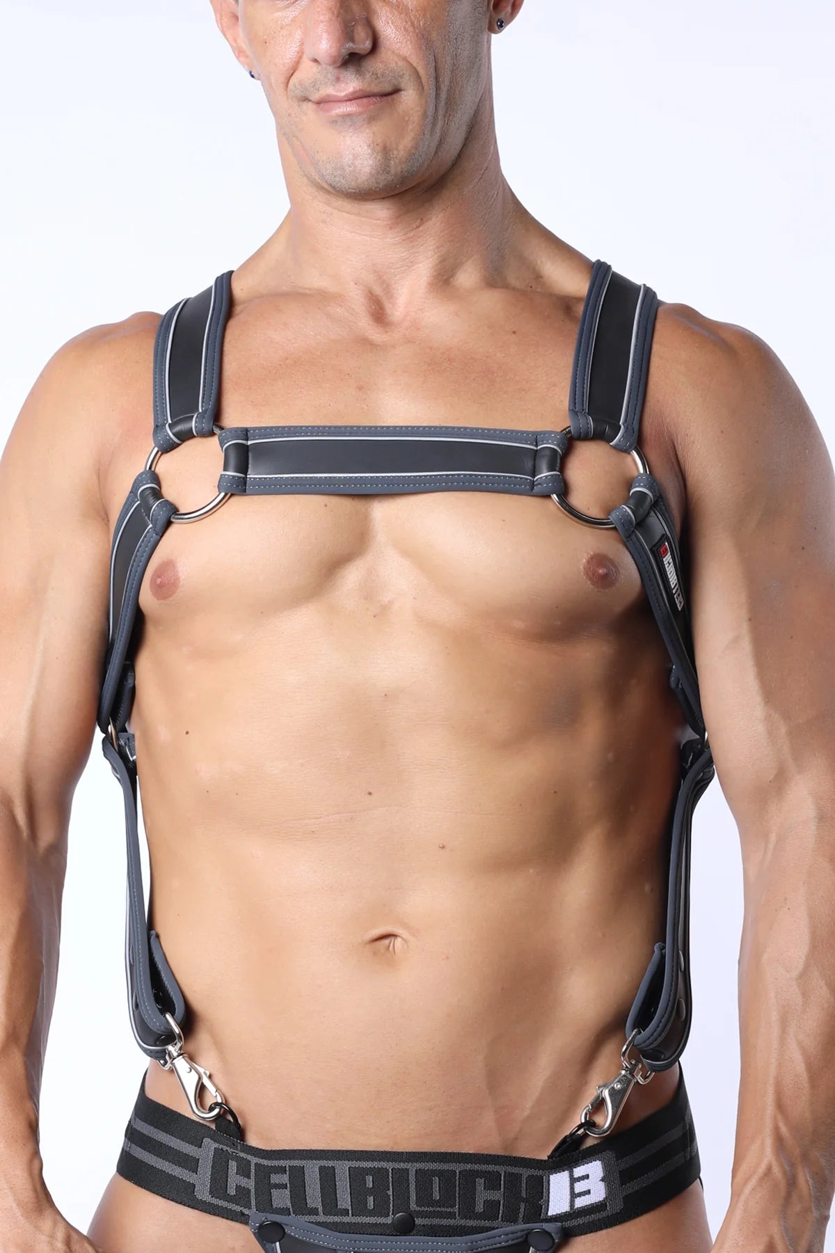 - CELLBLOCK 13'S LATEST NEOPRENE HARNESS WITH FETISH COLOR & REFLECTIVE PIPING , METAL O-RINGS AND HOOKS; FUNCTIONAL METAL SNAPS AT CHEST AND TORSO ADJUST TO FIT