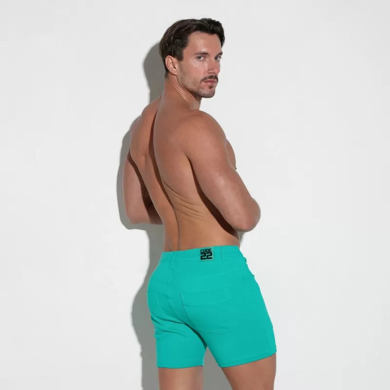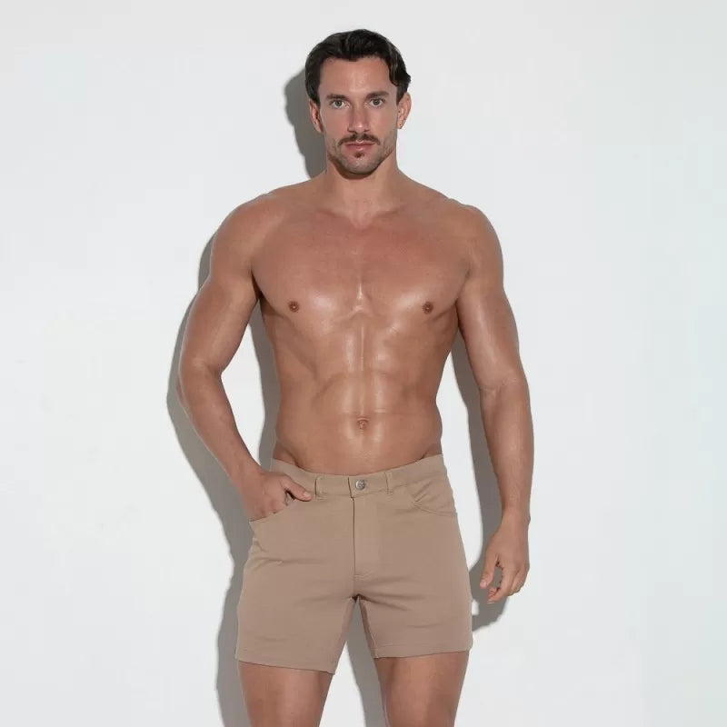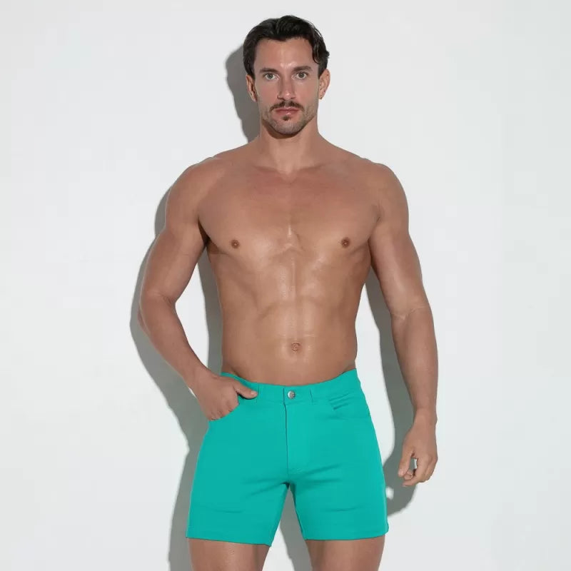 Slim fitting short made with stretch technology. Low rise with a zipped fly and five pockets. Iconic silicone logo badge on back waist.