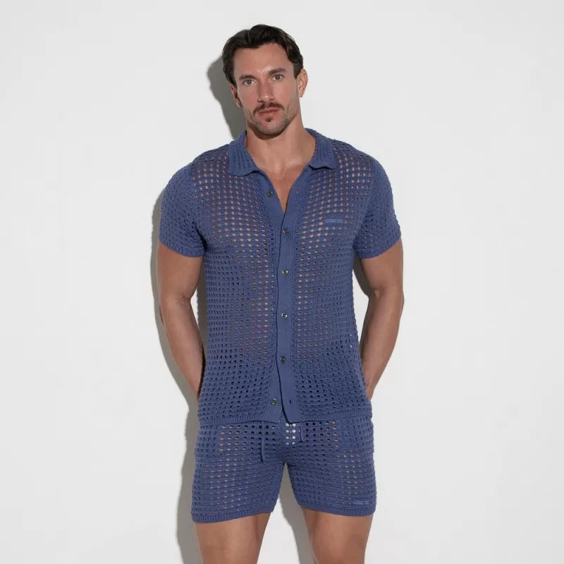 Crochet diamond knit made of finest viscose/cotton. Rib collar edge with same finishing around sleeves and bottom. Button fastening and embroidered logo on the chest.