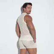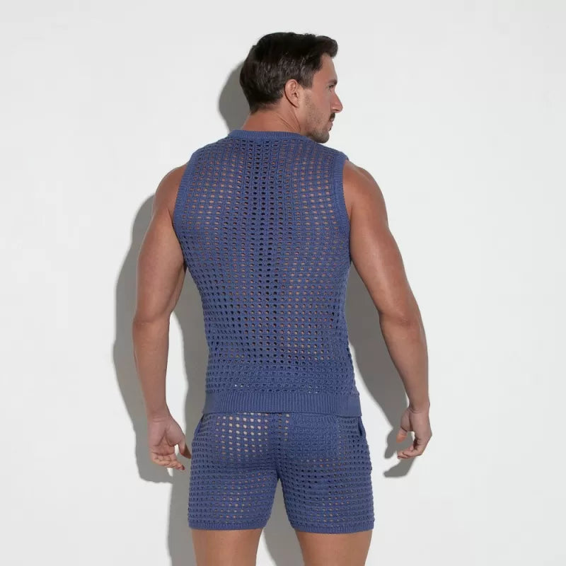 Crochet diamond knit made of finest viscose/cotton. Rib finishing around neck, open armhole and bottom with our embroidered logo on the chest.