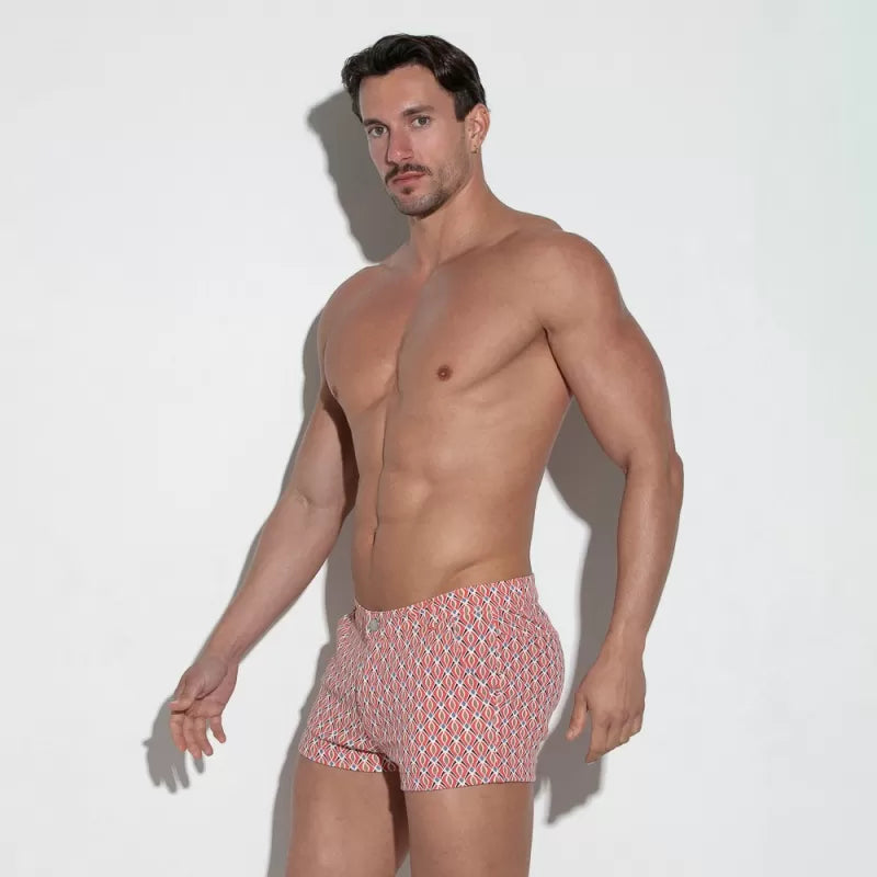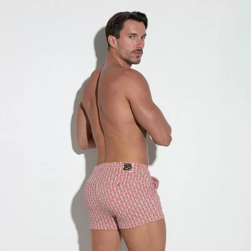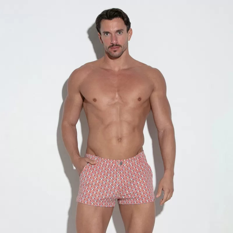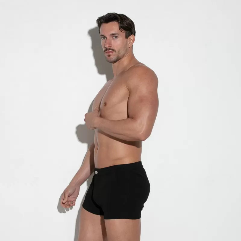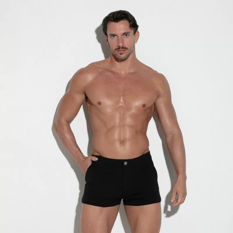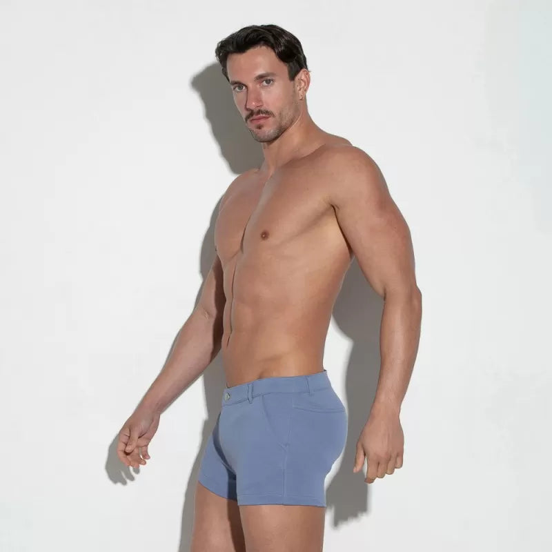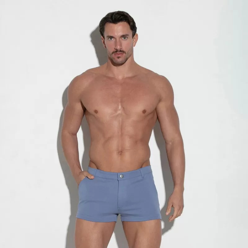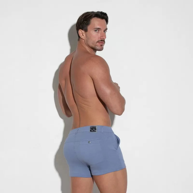 Slim fitting blue short made with stretch technology. Low rise with a zipped fly and pockets with a 2” inch / 5.5cm inseam. Iconic silicone logo badge on back waist.