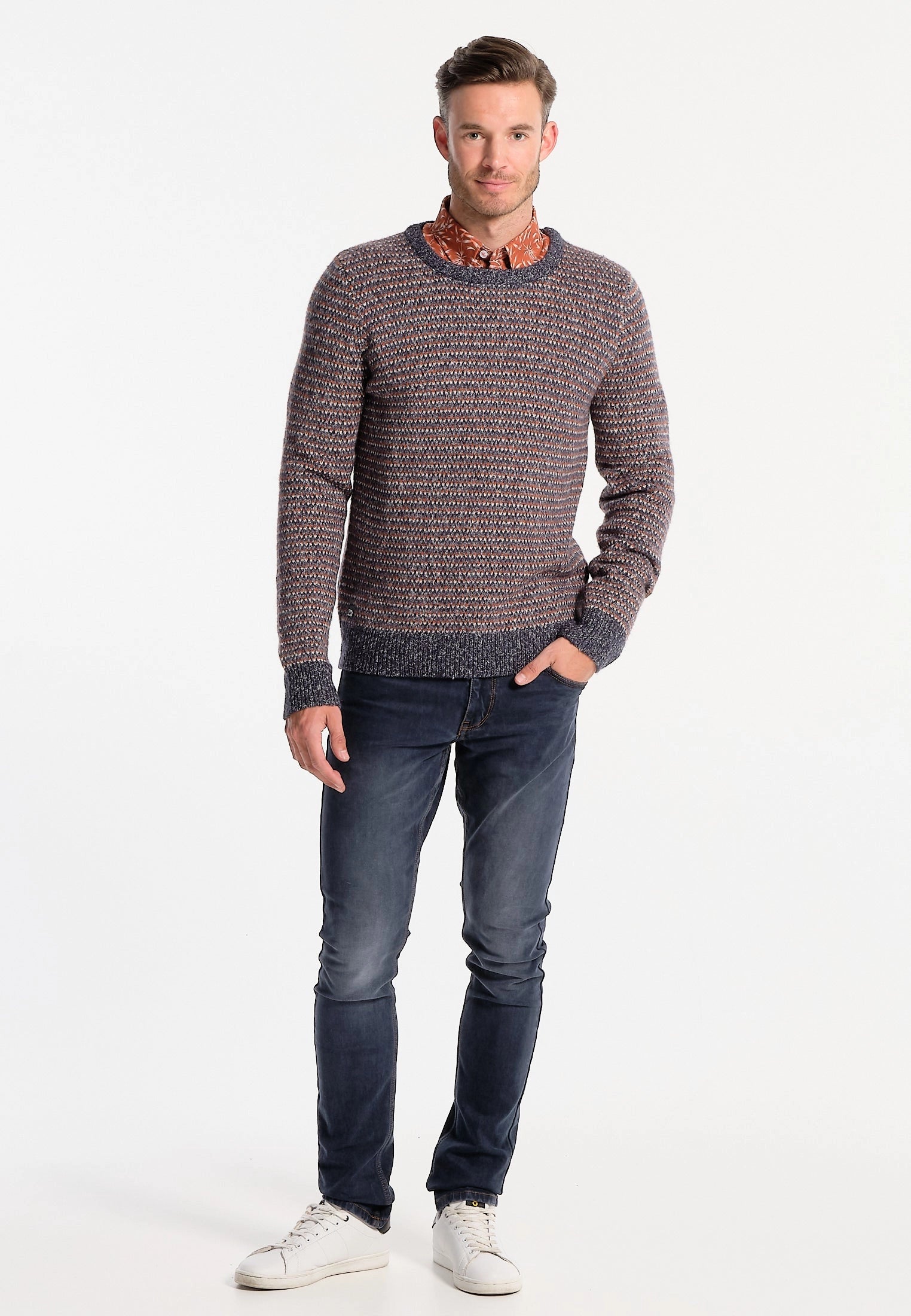 This beautiful navy and brown men's sweater, inspired by the beauty of the Great Lakes, is a must-have for your autumn-winter wardrobe. Carefully made in a straight cut, this sweater offers optimal comfort thanks to its quality material. The stylish ribbed round neck adds a touch of originality to this model. Stretch ribbed edges and cuffs provide a snug fit and extra comfort. The long sleeves will keep you warm on cool days. The printed design adds a unique touch of style to this sweater. Finally, the gummed J&JOY patch at the bottom right testifies to the authenticity and quality of this product.