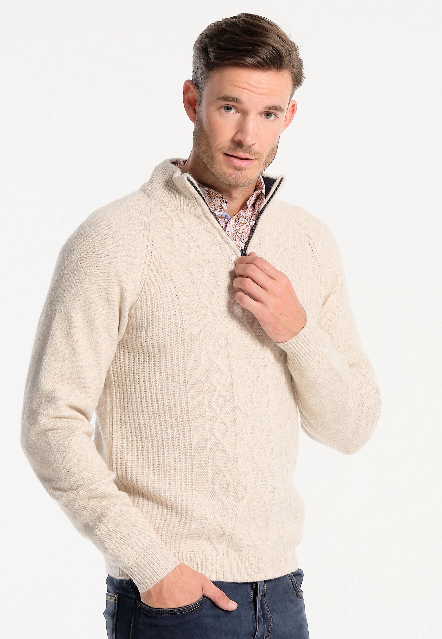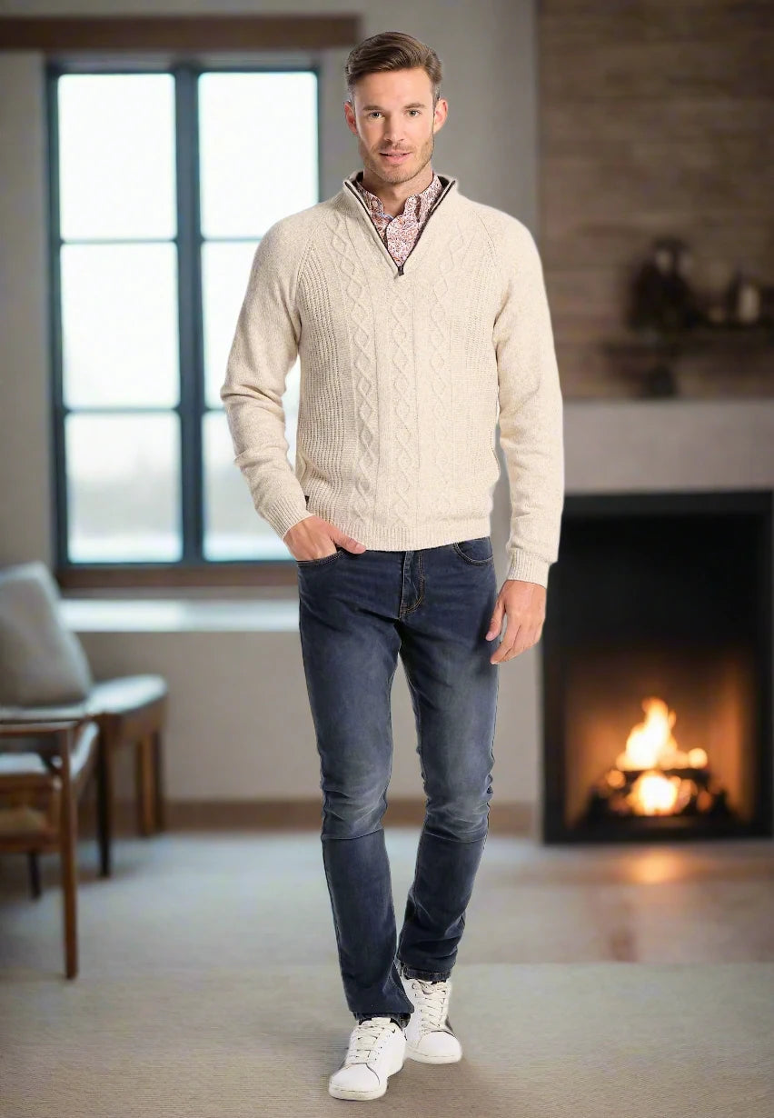 Get warm in style this winter with this cream men's sweater inspired by the forests of Michigan. Carefully crafted, this sweater offers an impeccable straight cut and is made with high quality braided wool for optimal comfort. The zipped stand-up collar adds a modern and practical touch to this sweater, while the stylish ribbed edges in the collar add a touch of sophistication. The stretch ribbed edges and cuffs ensure a perfect fit all day long. With its long sleeves and its two-tone pattern, this sweater is both stylish and trendy. The embroidered/gummed J&JOY logo on the heart testifies to the quality and authenticity of the product