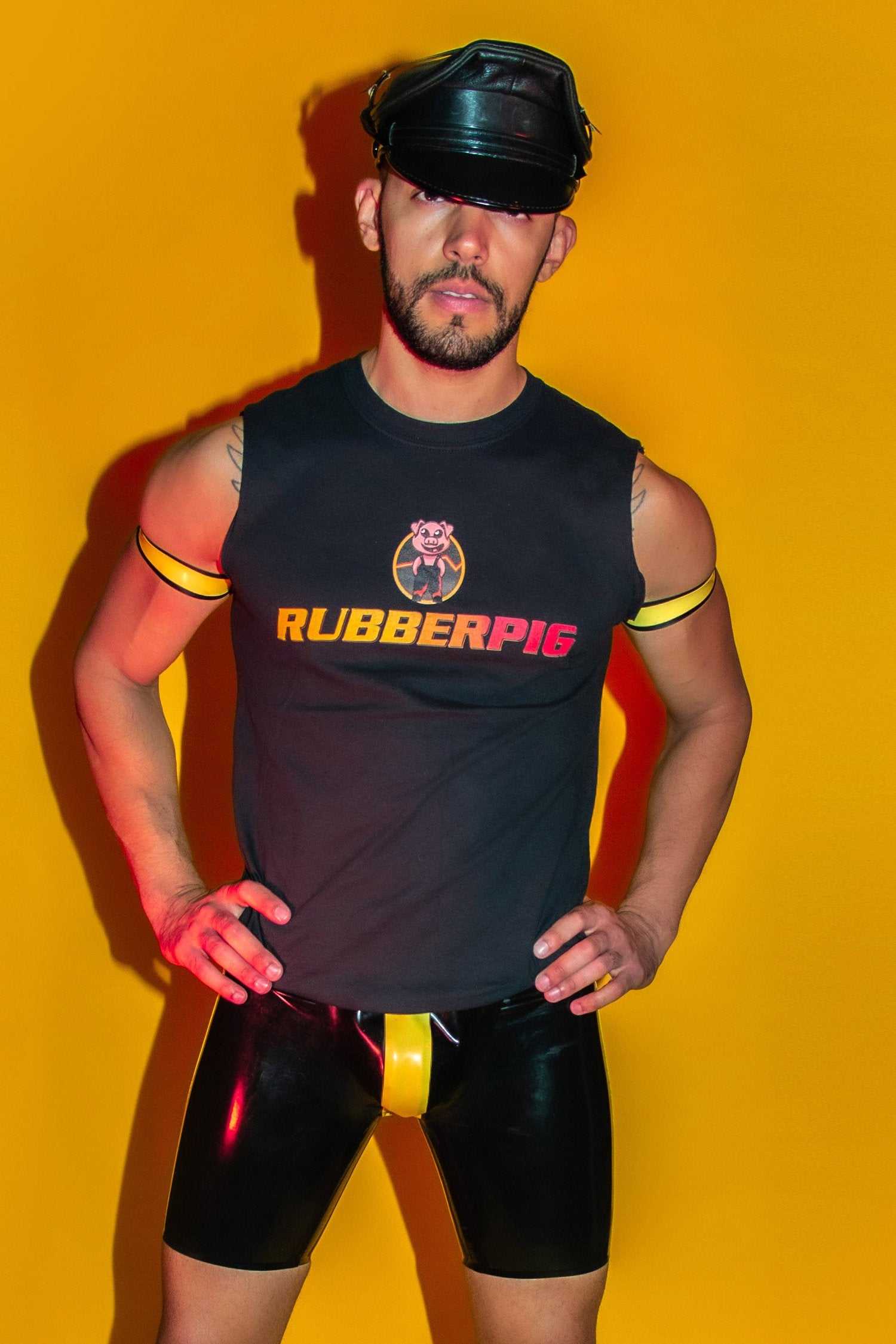 Be sexy, slick and sly in our new Rubber Pig Tee. Show off your Rubber Pride with this sexy shirt! Pair with your favorite latex leggings, shorts or jock. Wear it out to the Eagle, your next fetish party, Folsom, or to your friend’s baby showery. Let the world know what turns you on!!