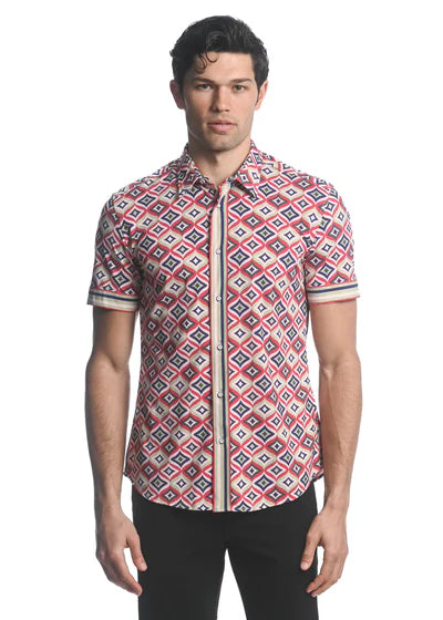 Printed short sleeve knit performance shirt featuring a spread collar, multi-stripe front button placket and sleeve border cuffs, a curved hem, and cut slim on the shoulders, chest, and biceps to create a tapered athletic fit. Made from a unique ultra-light and super-soft, quick dry, micro perforated mesh fabric for maximum breathability. Nylon and elastane yarn blend provides structure to the garment and enables the fabric to move with the body. All-over navy and ivy stars print pattern on a red background.