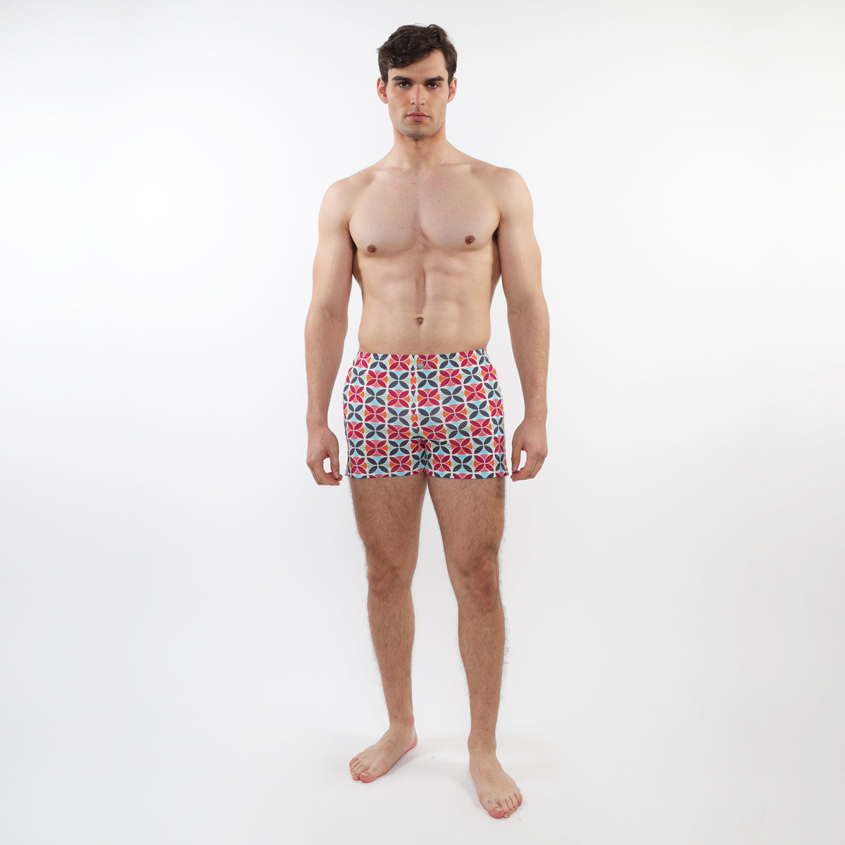 Our best-selling swim shorts get a retro twist in this bold yet wearable print. Crafted from a unique seersucker fabric base with 4-way stretch, the tailored 2.5-inch inseam and side slits offer mobility and a clean silhouette. Features include a relaxed elastic waistband with logo button, hidden zippered slash pockets, and a back border pocket with concealed zipper. Inside, a breathable mesh lining ensures no-chafe support. Teal and coral oval shapes pop over an ecru background, bringing mid-century charm with modern polish.