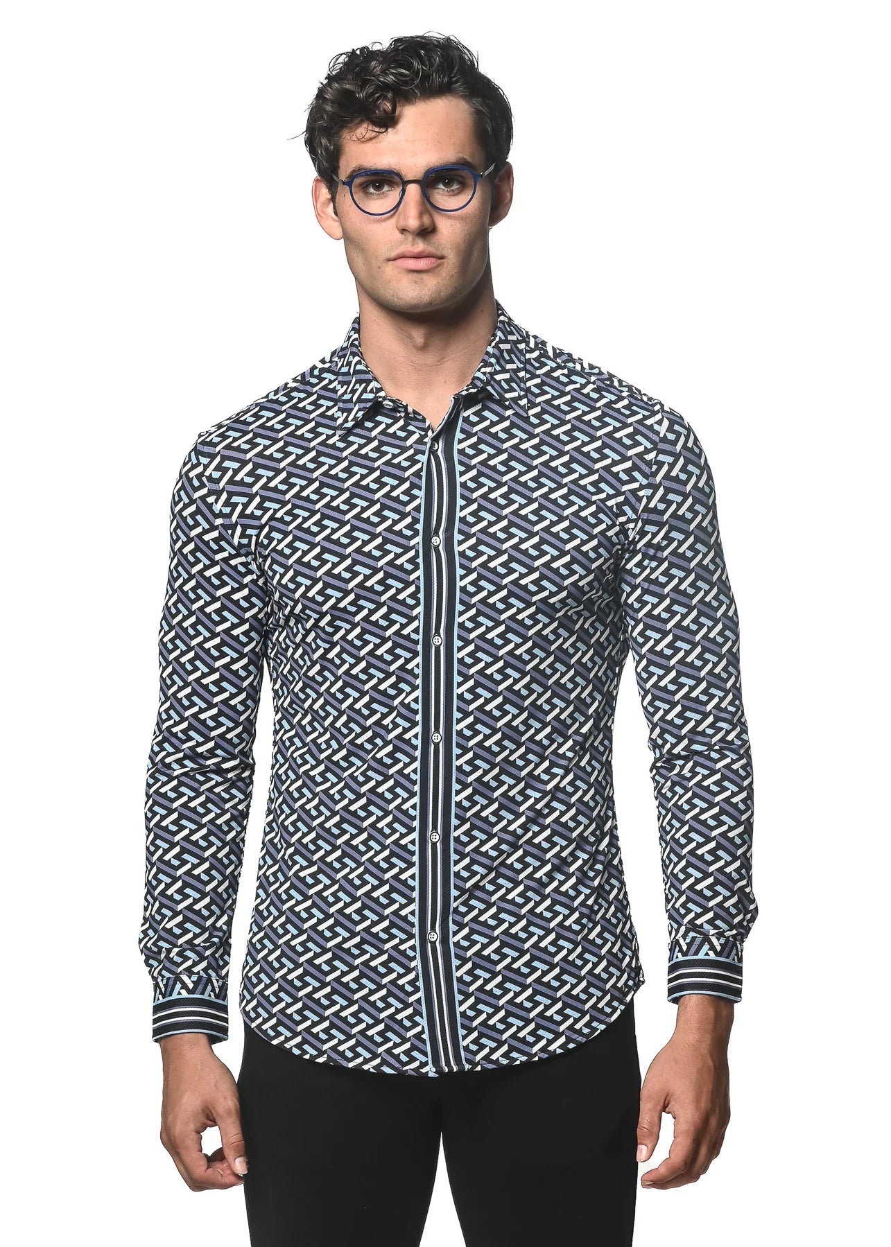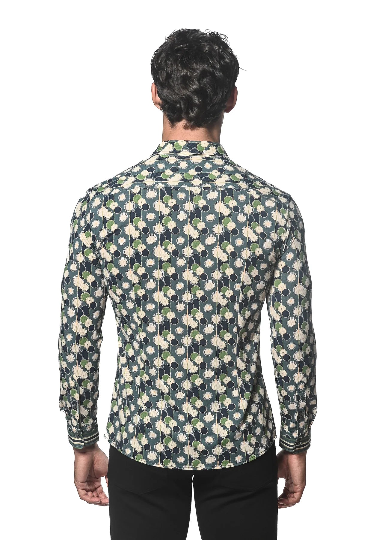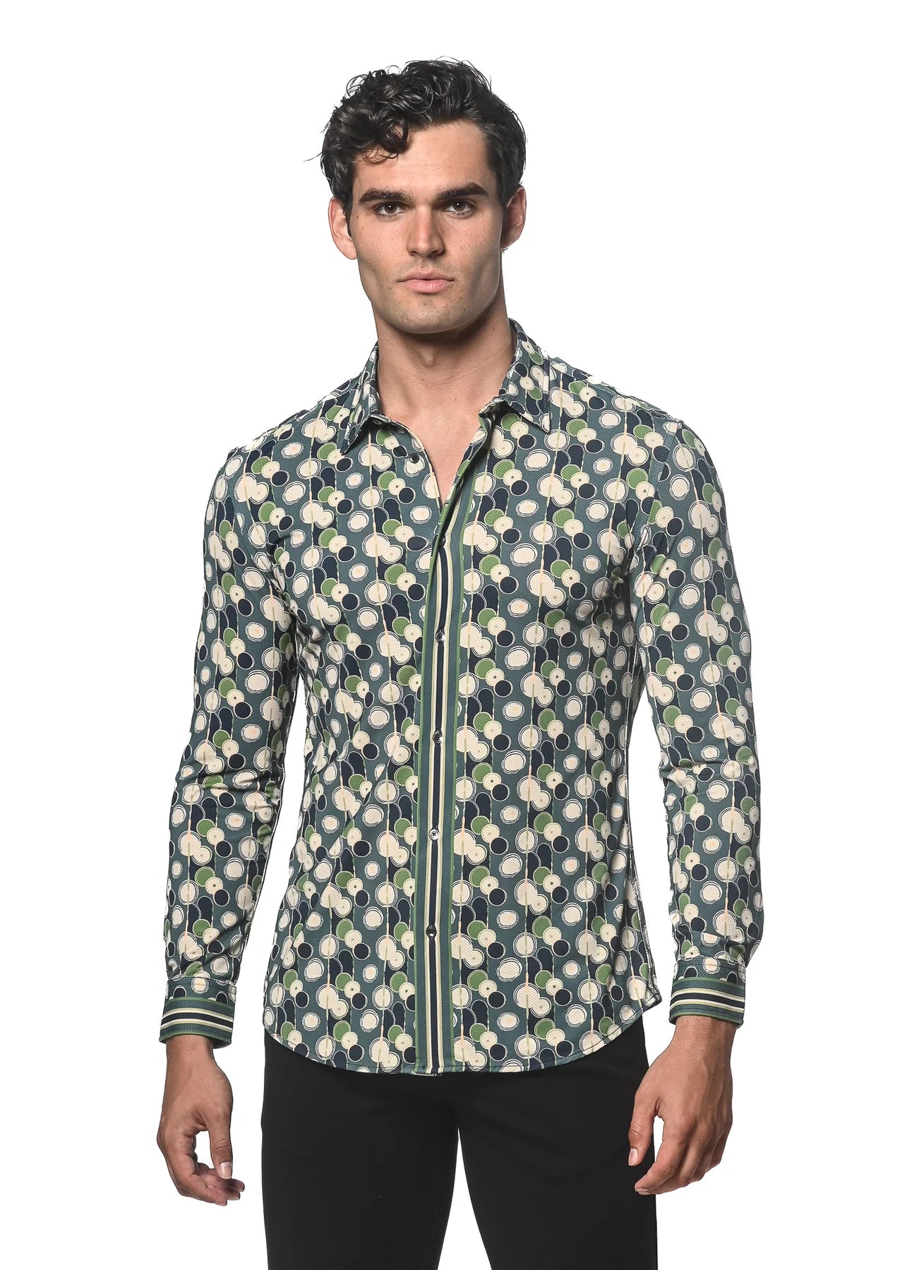 Printed long sleeve knit performance shirt featuring a spread collar, multi-stripe front button placket and sleeve cuffs, a curved hem, and cut slim on the shoulders, chest, and biceps to create a tapered athletic fit. Made from a unique ultra-light and super-soft, quick dry, micro perforated mesh fabric for maximum breathability. Nylon and elastane yarn blend provides structure to the garment and enables the fabric to move with the body. All-over fern, navy and beige overlapping circles print pattern on a deep aquamarine background.