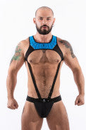 The Harness shape resembles a small Tank Top .Two strips are sewn on the side that extend downwards, at the end of the strips there is the Iron cockring which is easily detachable using the press snaps on the elastic strips.