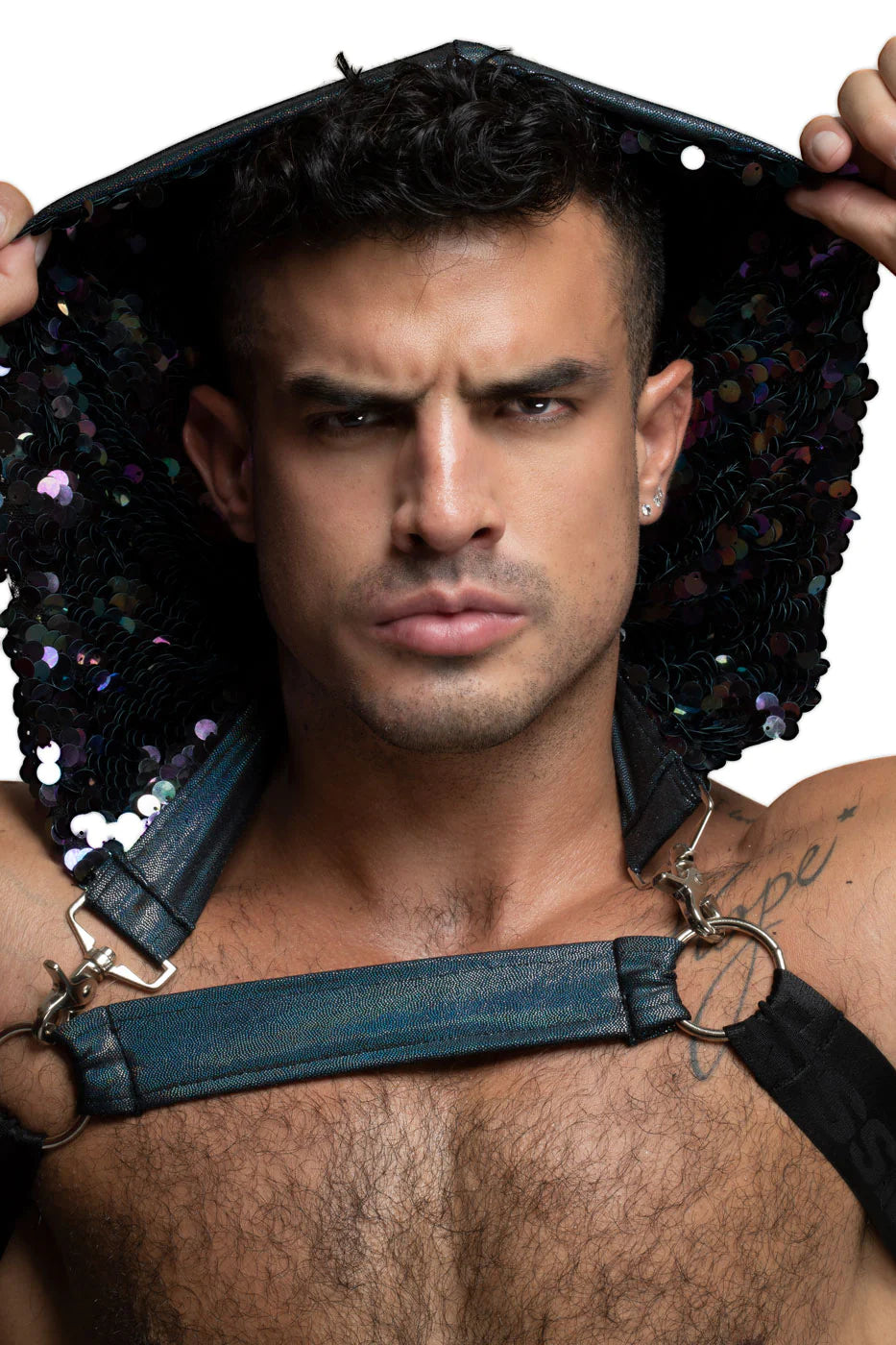 This black and holographic WhoreNess is an eye-catching night shade soiree of color made out of an intense onyx aurora and lined with large matching light reflective sequins. Be the darkest shade and have all the color too. Like all other Original WhoreNess "hooded harnesses" this item is reversible, Fully Adjustable, and One size fits most.