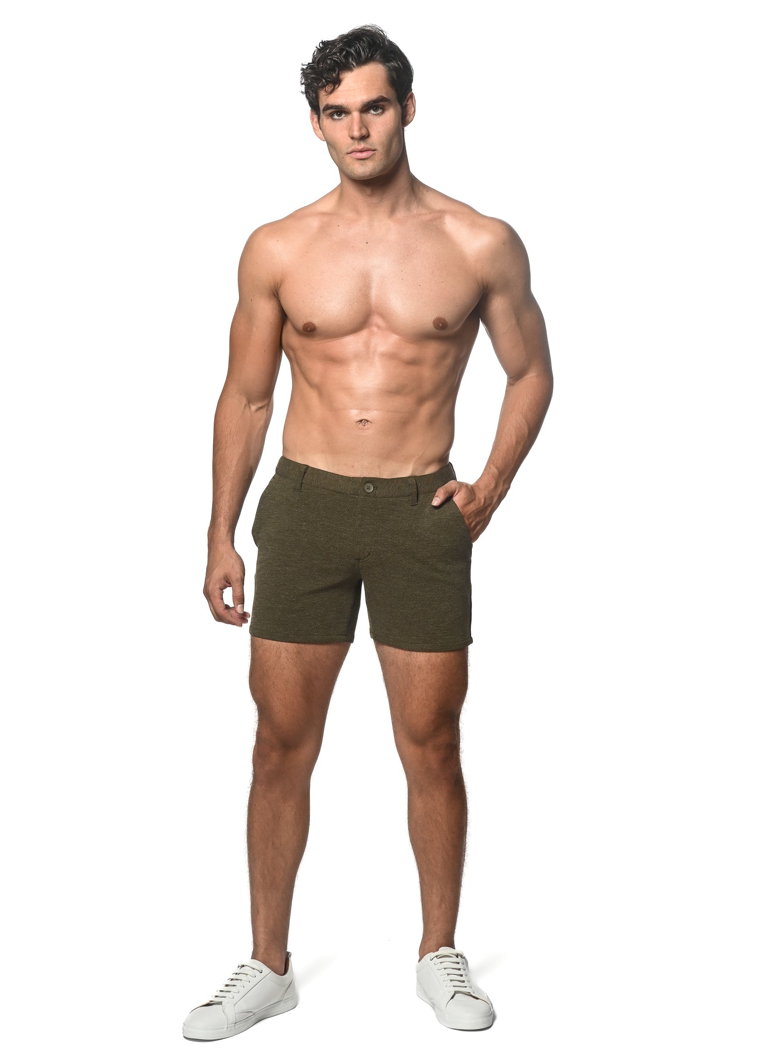 Army textured stretch knit chino shorts cut slim with a shorter length for an enhanced, flattering silhouette. Features our signature curved, stretch waistband, zip fly and dyed-to-match button closure. Fabricated from an ultra-soft, stretch knit fabric for maximum comfort and performance. The unique fabric knit structure has a super soft hand and excellent shape recovery with a lot of stretch for a perfect fit wash after wash. Inseam length is 5".
