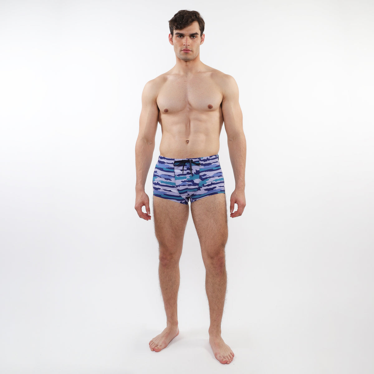 Classic low-rise printed swim trunks with front pouch lining, cut slim through the hips and thighs with a shorter 2" inseam for a sharp, tailored fit that enhances the legs and backside. Designed with our signature continuous self-fabric elastic waistband, a contoured pouch, and dyed-to-match drawcord with silicone aglets for a clean, functional finish.