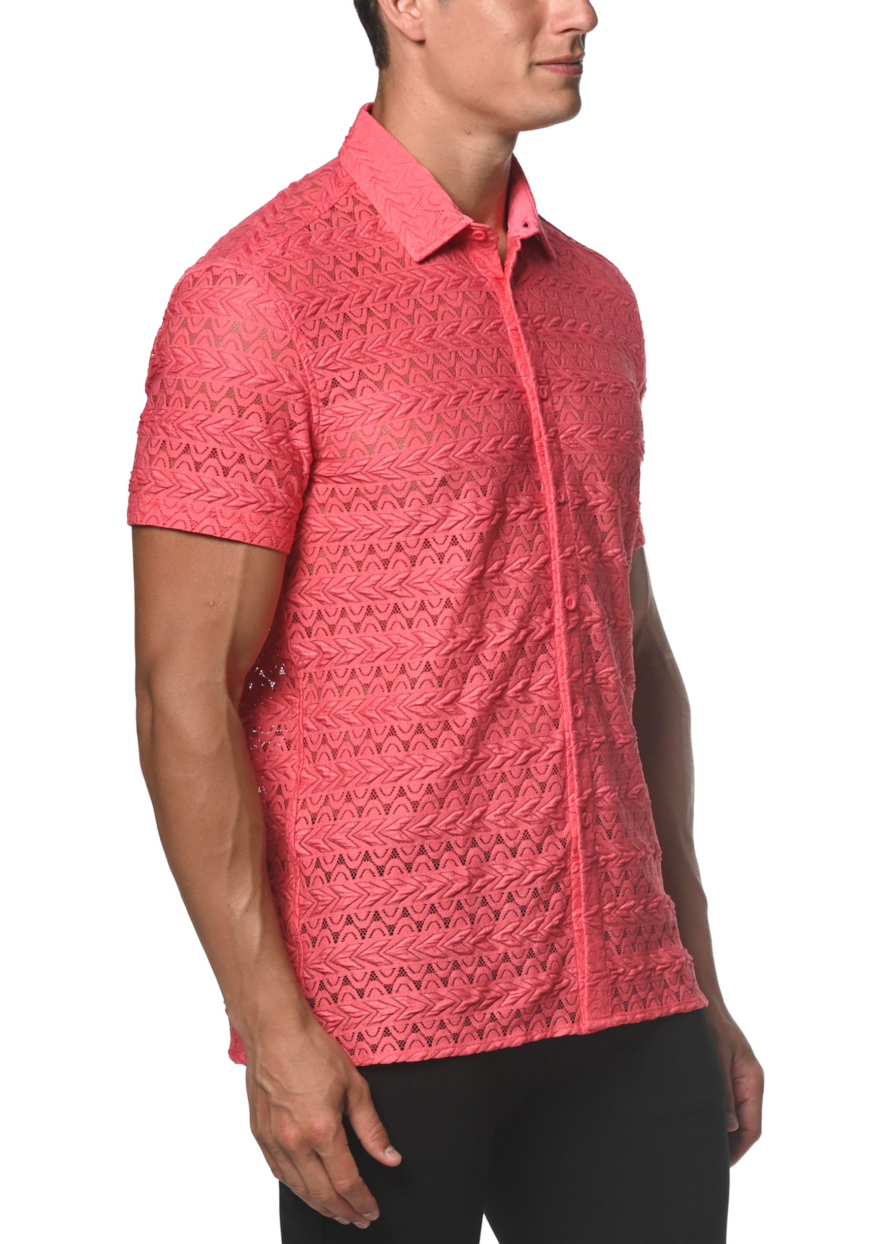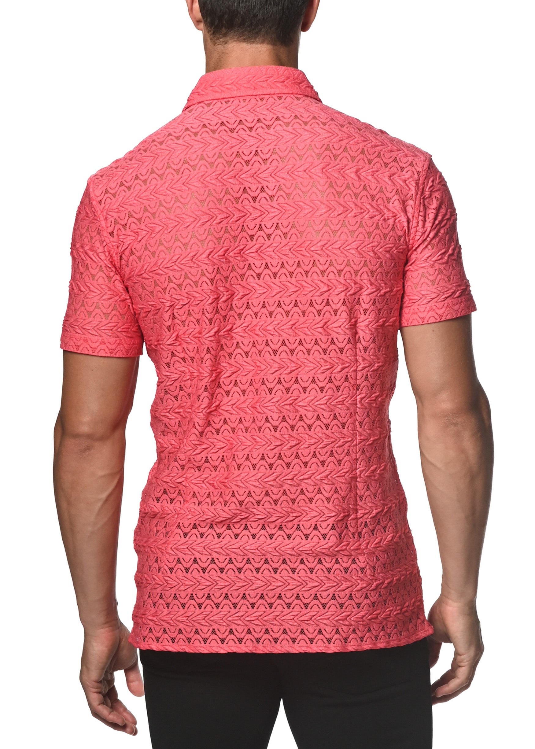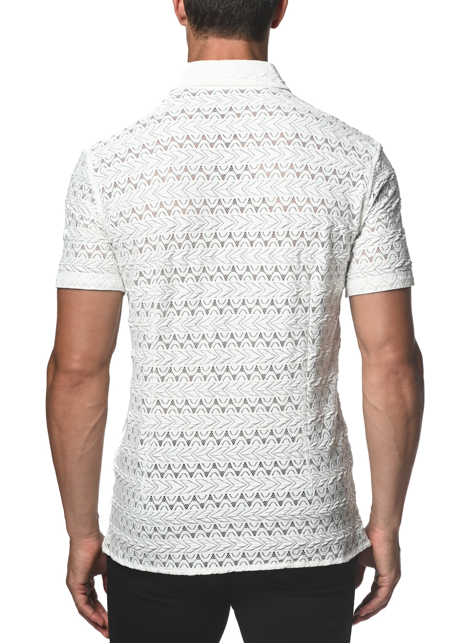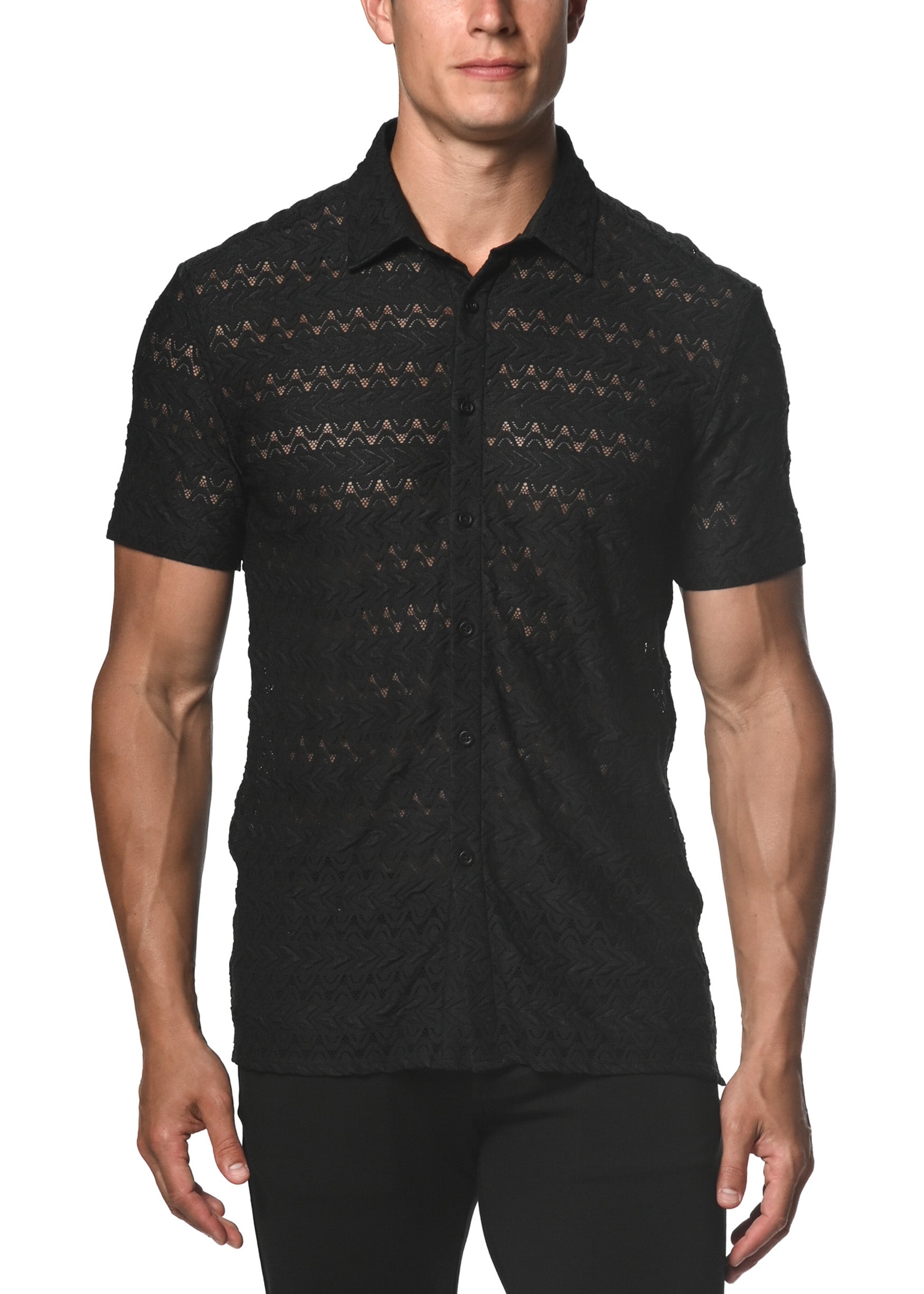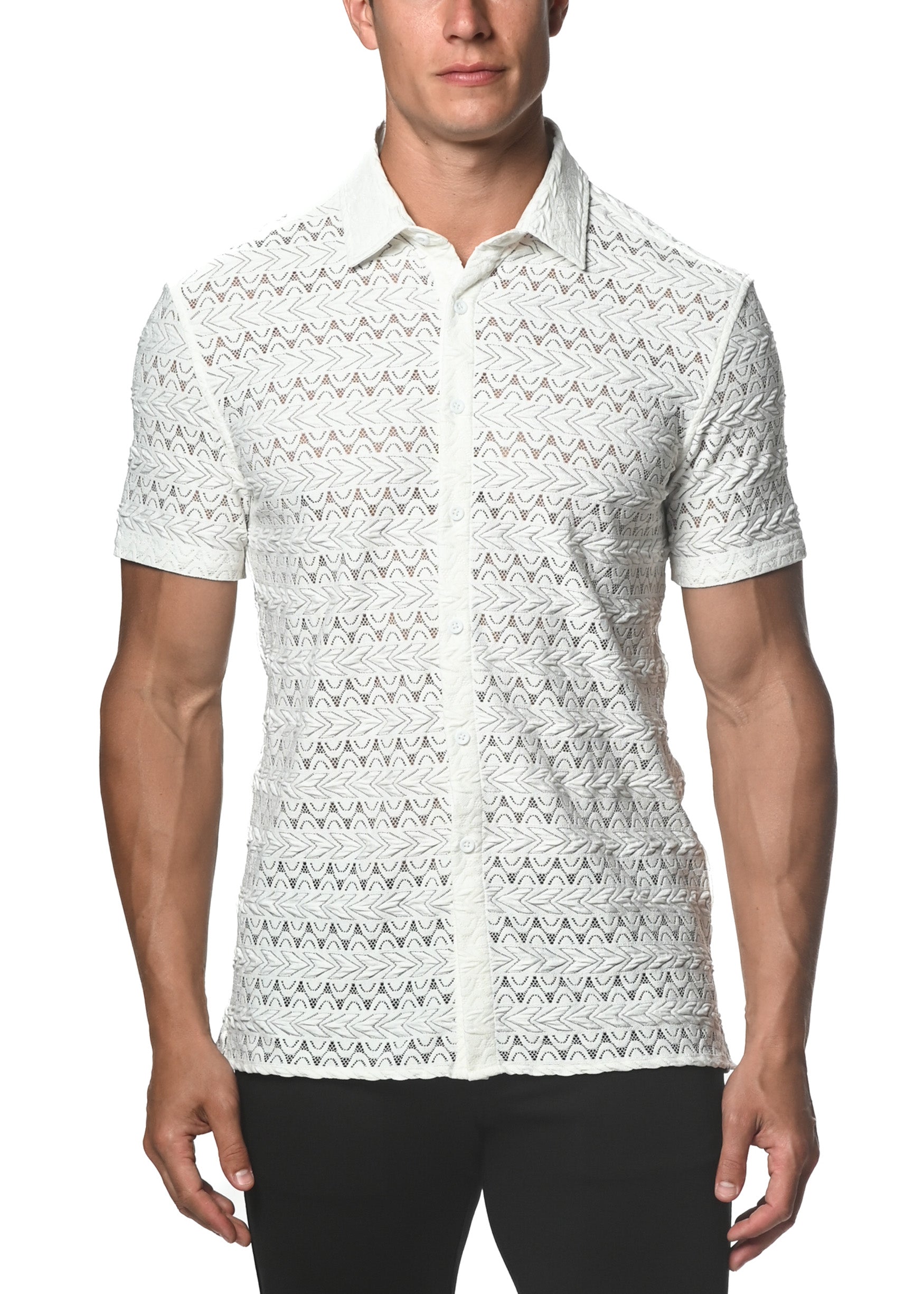 Darts stretch lace gossamer shirt featuring a spread collar, front button placket, a straight hem, side slits and cut slim on the shoulders, chest and biceps with back darts to create a pronounced taper at the waist. Made from a super lightweight lace fabric with a natural stretch for maximum comfort. Delicate fabric care.