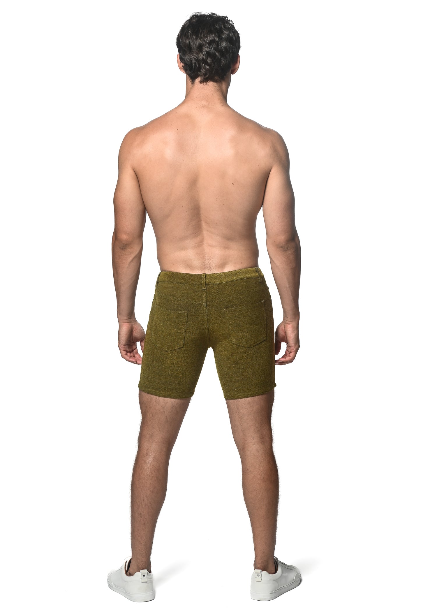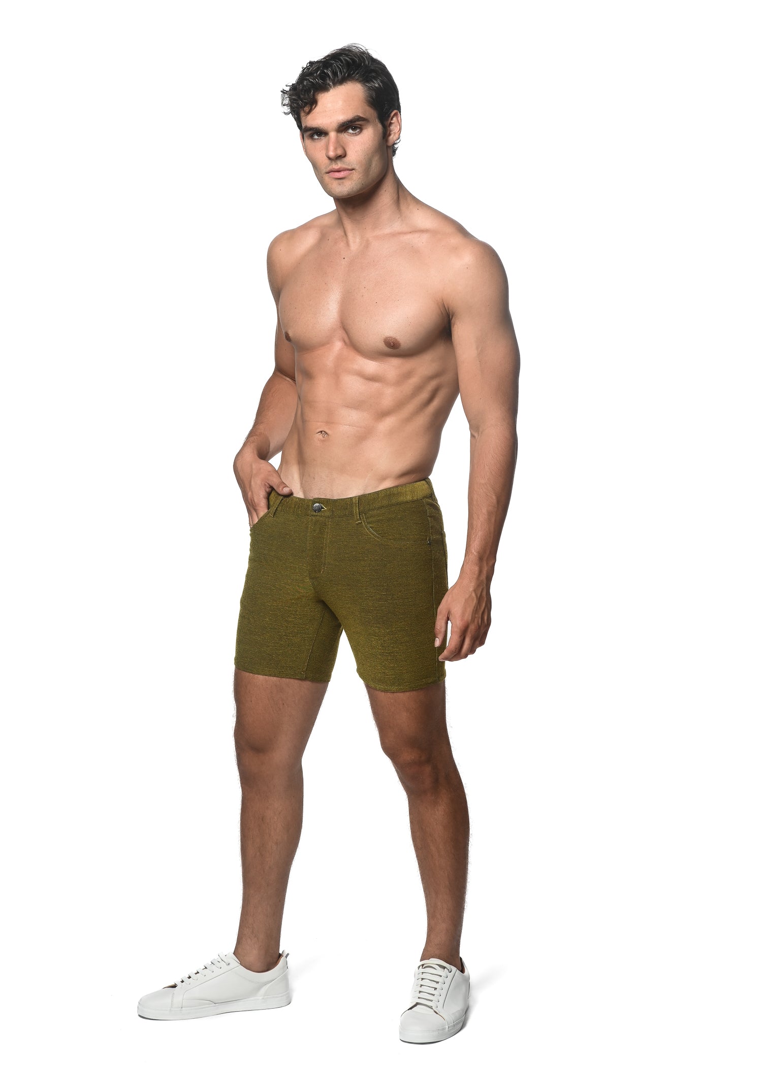 Khaki and white diamonds jacquard stretch knit shorts cut slim with a new shorter length for an enhanced, flattering silhouette. Features our signature curved, stretch waistband, metal rivets, zip fly and metal button closure. Fabricated from an ultra-soft, all-over embossed stretch jacquard knit fabric for maximum comfort and performance. The unique fabric knit structure has a super soft hand and excellent shape recovery with a lot of stretch for a perfect fit wash after wash. Inseam length is 3".