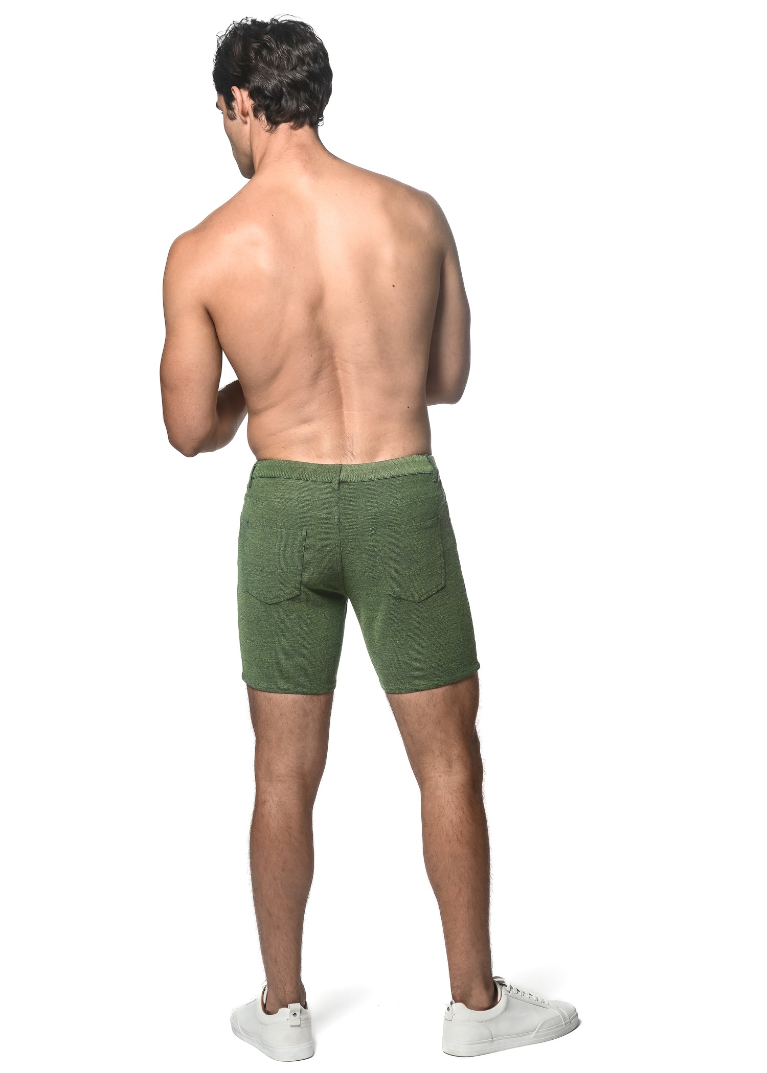 5-pocket stretch knit jeans shorts cut slim with a shorter length for an enhanced, flattering silhouette. Features our signature curved, stretch waistband, metal rivets, zip fly and metal button closure. Fabricated from an ultra-soft, 4-way stretch knit fabric for maximum comfort and performance. The unique fabric knit structure has a super soft hand and excellent shape recovery with a lot of stretch for a perfect fit wash after wash. Inseam length is 5".