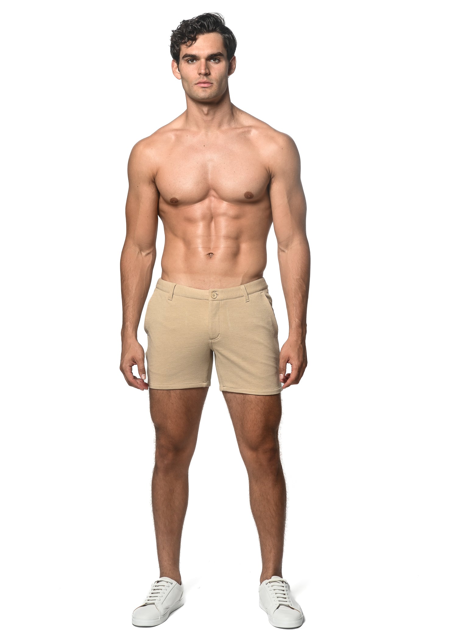 Khaki textured stretch knit chino shorts cut slim with a shorter length for an enhanced, flattering silhouette. Features our signature curved, stretch waistband, zip fly and dyed-to-match button closure. Fabricated from an ultra-soft, stretch knit fabric for maximum comfort and performance. The unique fabric knit structure has a super soft hand and excellent shape recovery with a lot of stretch for a perfect fit wash after wash. Inseam length is 5".