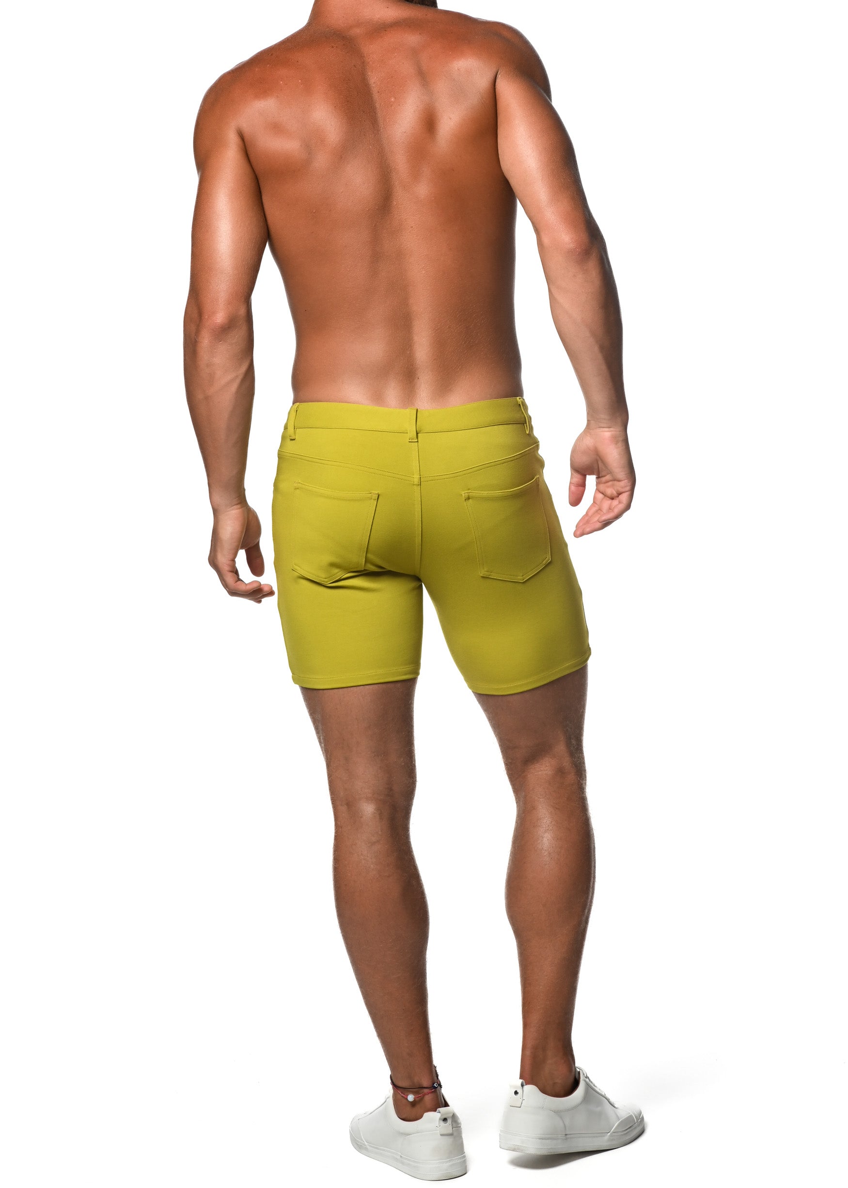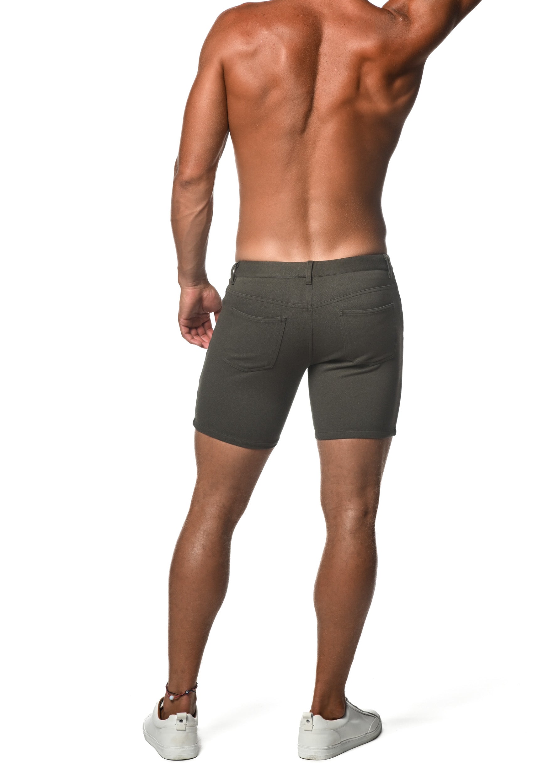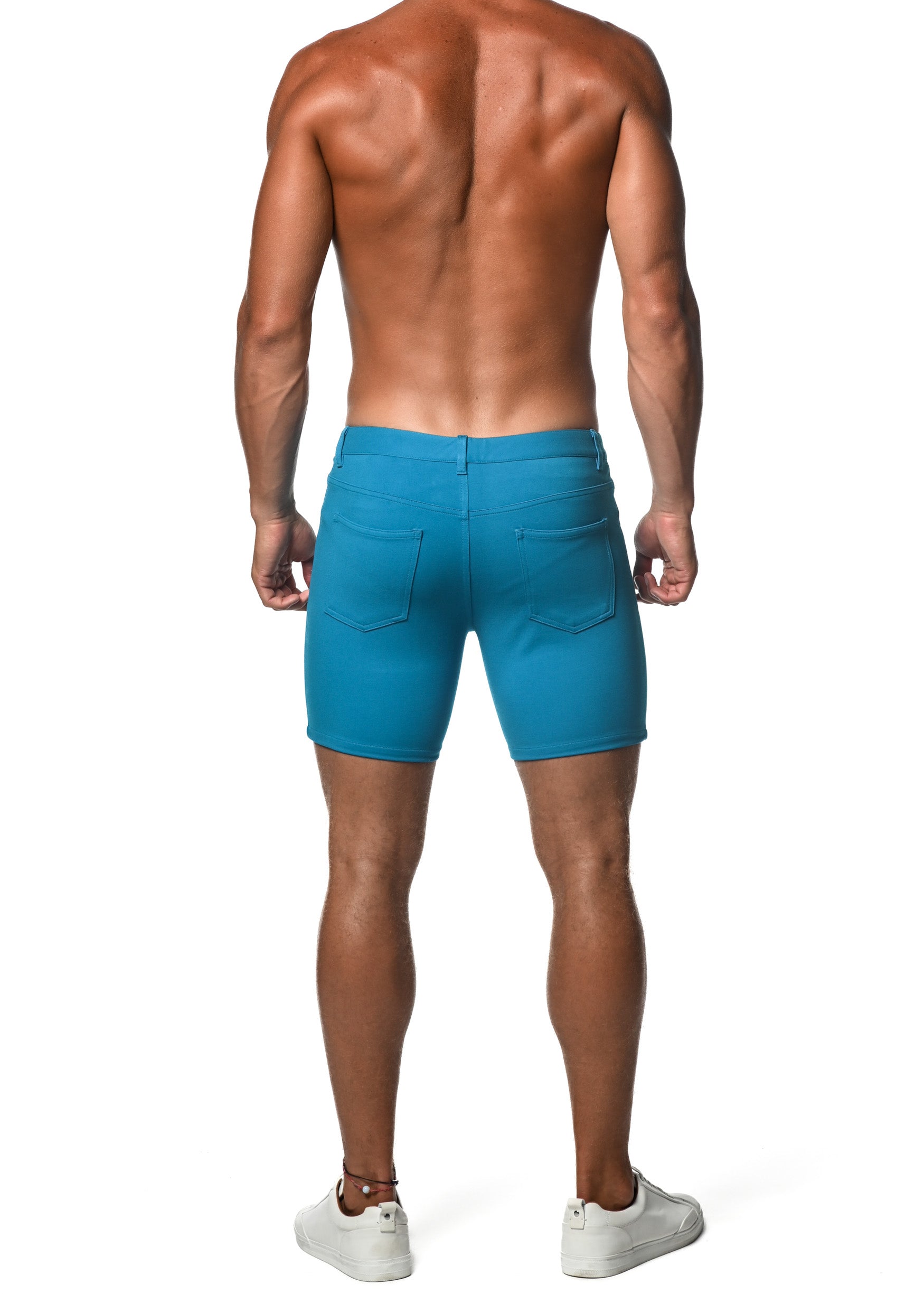 5-pocket stretch knit jeans shorts cut slim with a shorter length for an enhanced, flattering silhouette. Features our signature curved, stretch waistband, metal rivets, zip fly and metal button closure. Fabricated from an ultra-soft, 4-way stretch knit fabric for maximum comfort and performance. The unique fabric knit structure has a super soft hand and excellent shape recovery with a lot of stretch for a perfect fit wash after wash. Inseam length is 5".