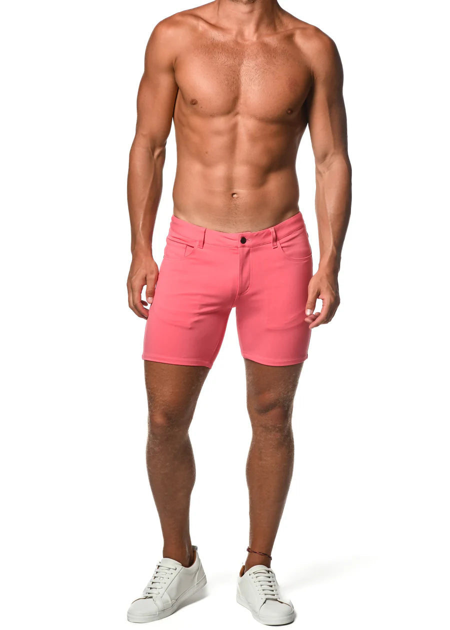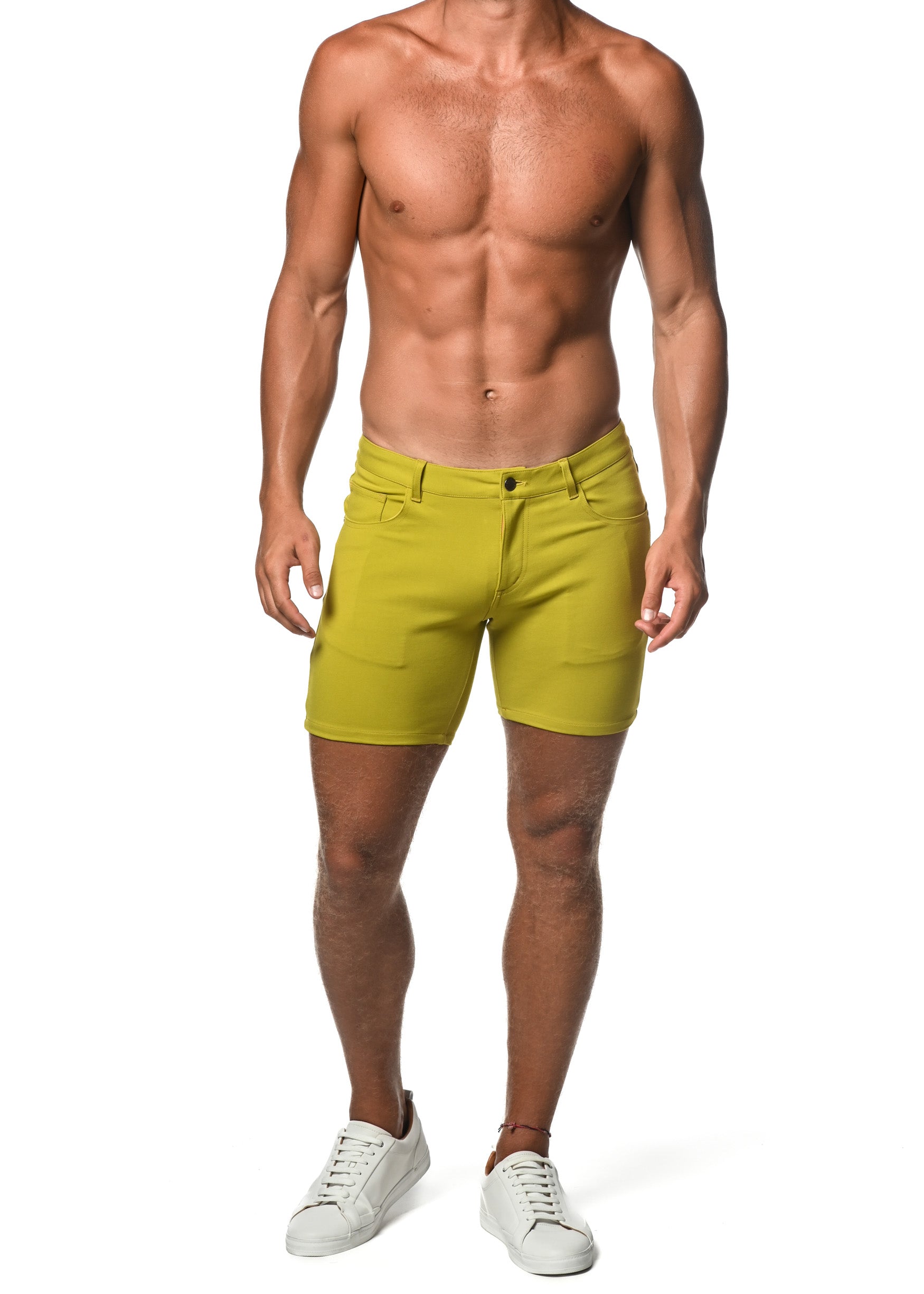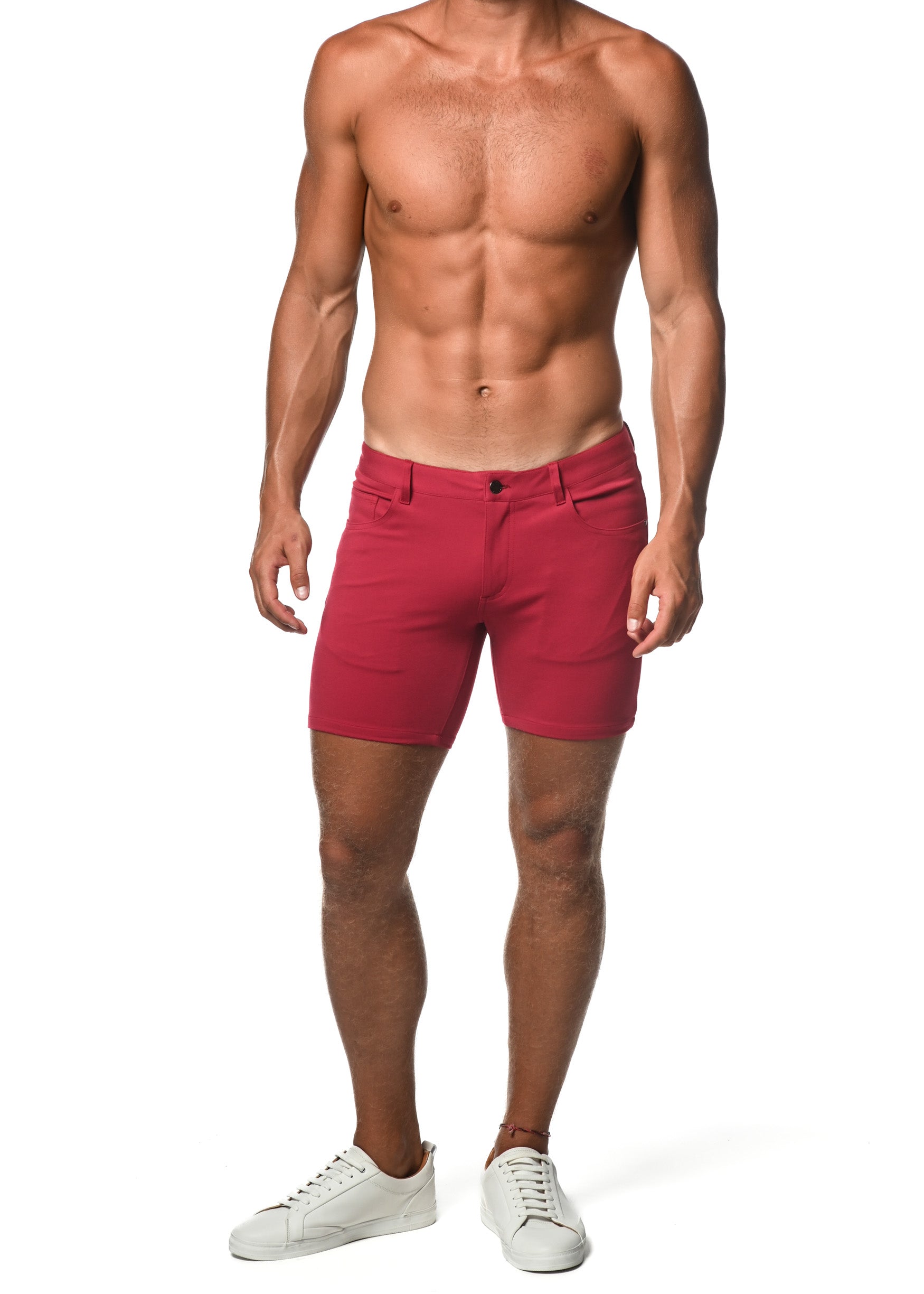 5-pocket stretch knit jeans shorts cut slim with a shorter length for an enhanced, flattering silhouette. Features our signature curved, stretch waistband, metal rivets, zip fly and metal button closure. Fabricated from an ultra-soft, 4-way stretch knit fabric for maximum comfort and performance. The unique fabric knit structure has a super soft hand and excellent shape recovery with a lot of stretch for a perfect fit wash after wash. Inseam length is 5".