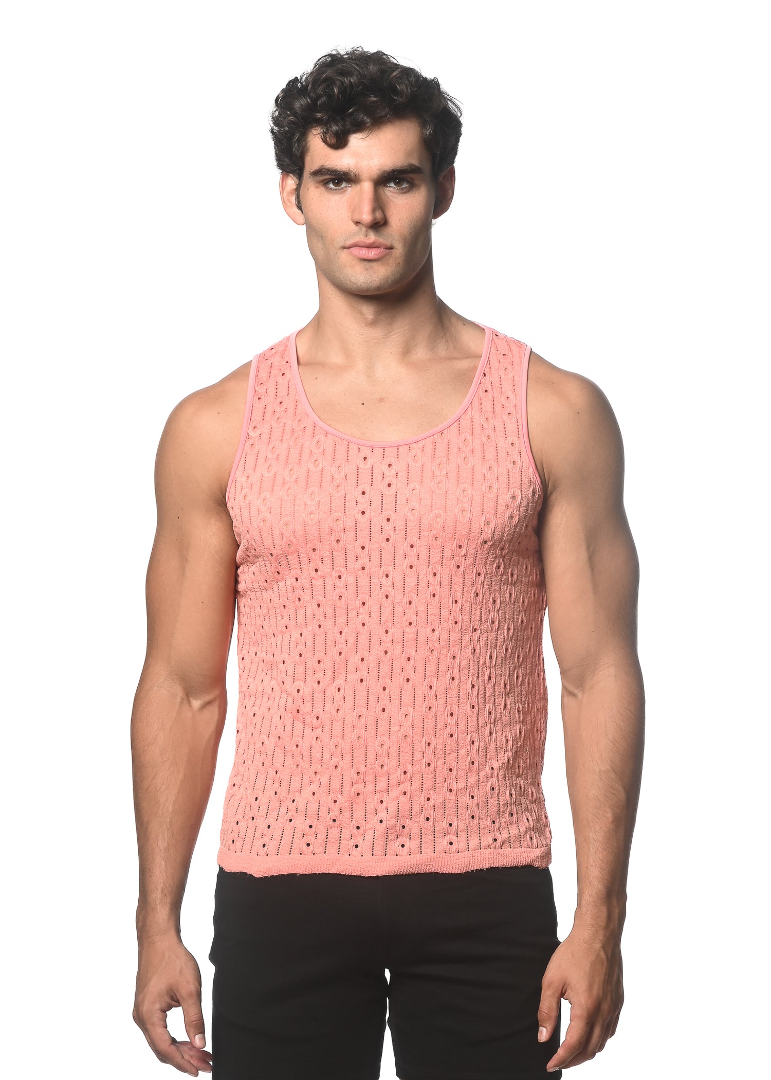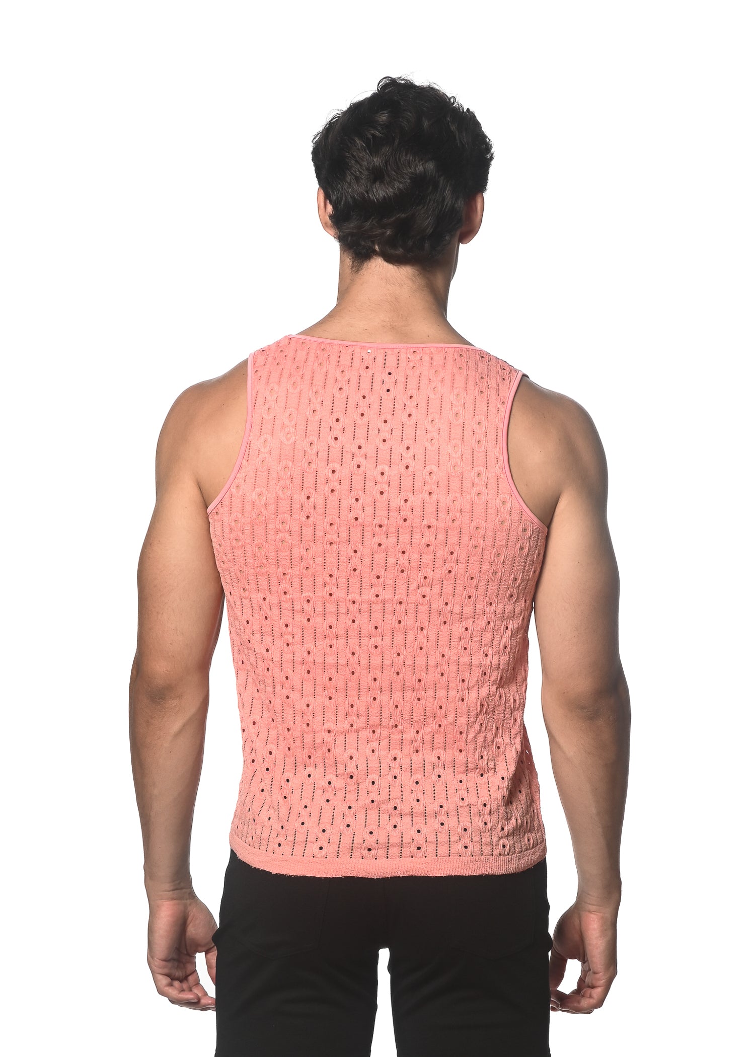 Dash Dot pattern gossamer lace stretch tank with a slightly tapered fit. Featuring a scoop neck, a sleeveless design, a straight hem and contrast binding. Made from a super lightweight gossamer lace fabric with a hint of stretch for maximum comfort. Delicate fabric care.