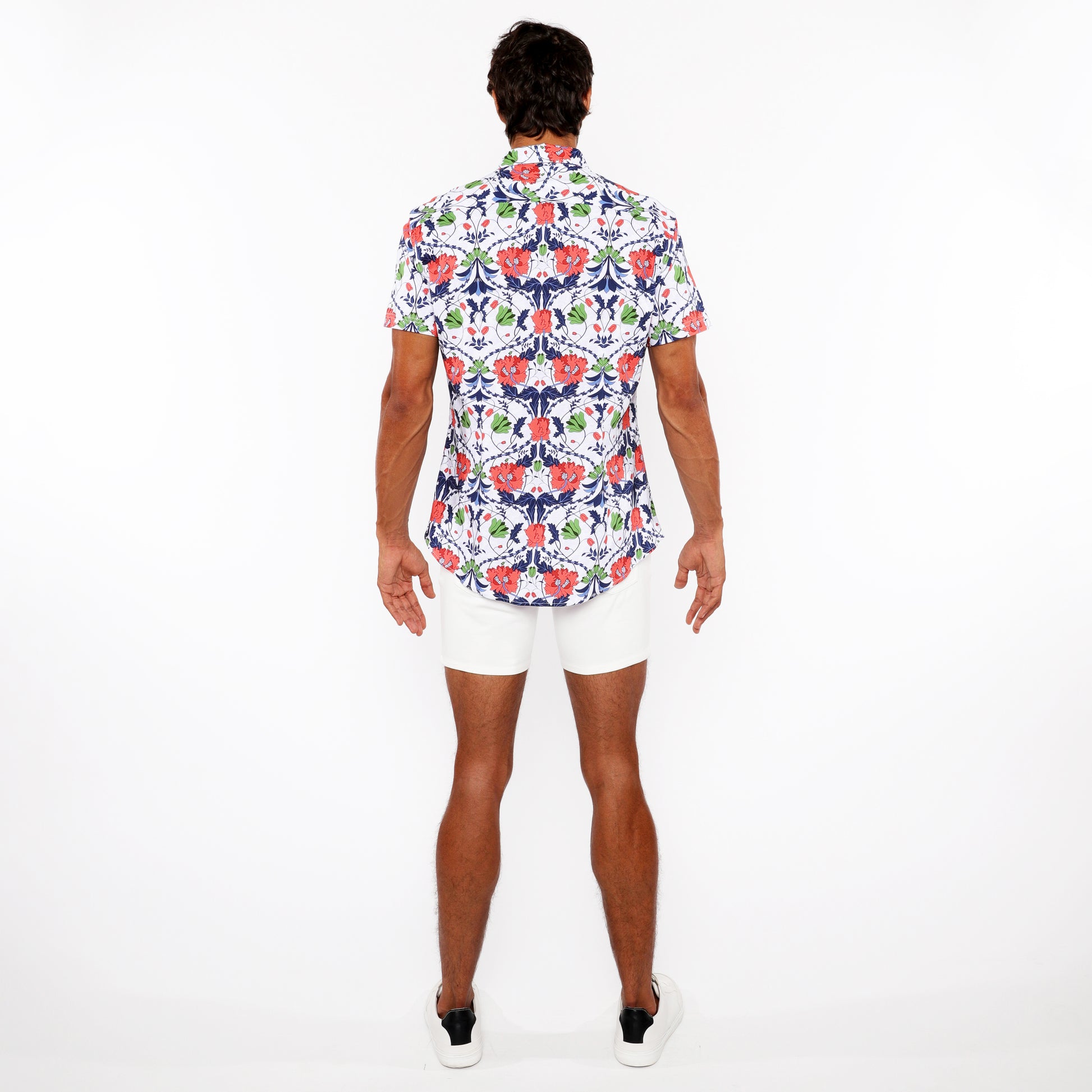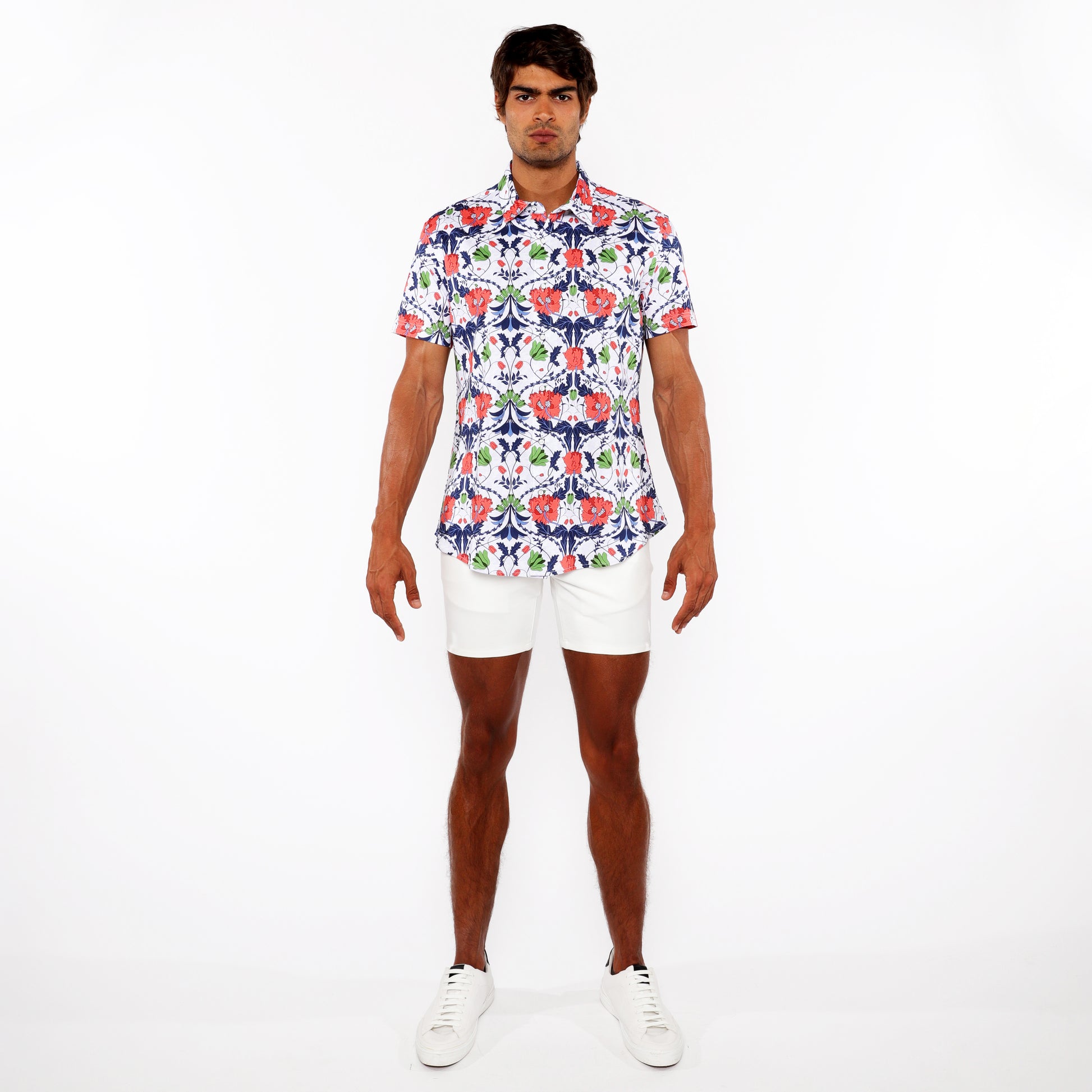 A vintage-inspired floral with the refinement of a tailored silhouette. Slim through the shoulders, chest, and biceps with subtle back darts, it’s designed for a clean, fitted look that enhances the upper body.