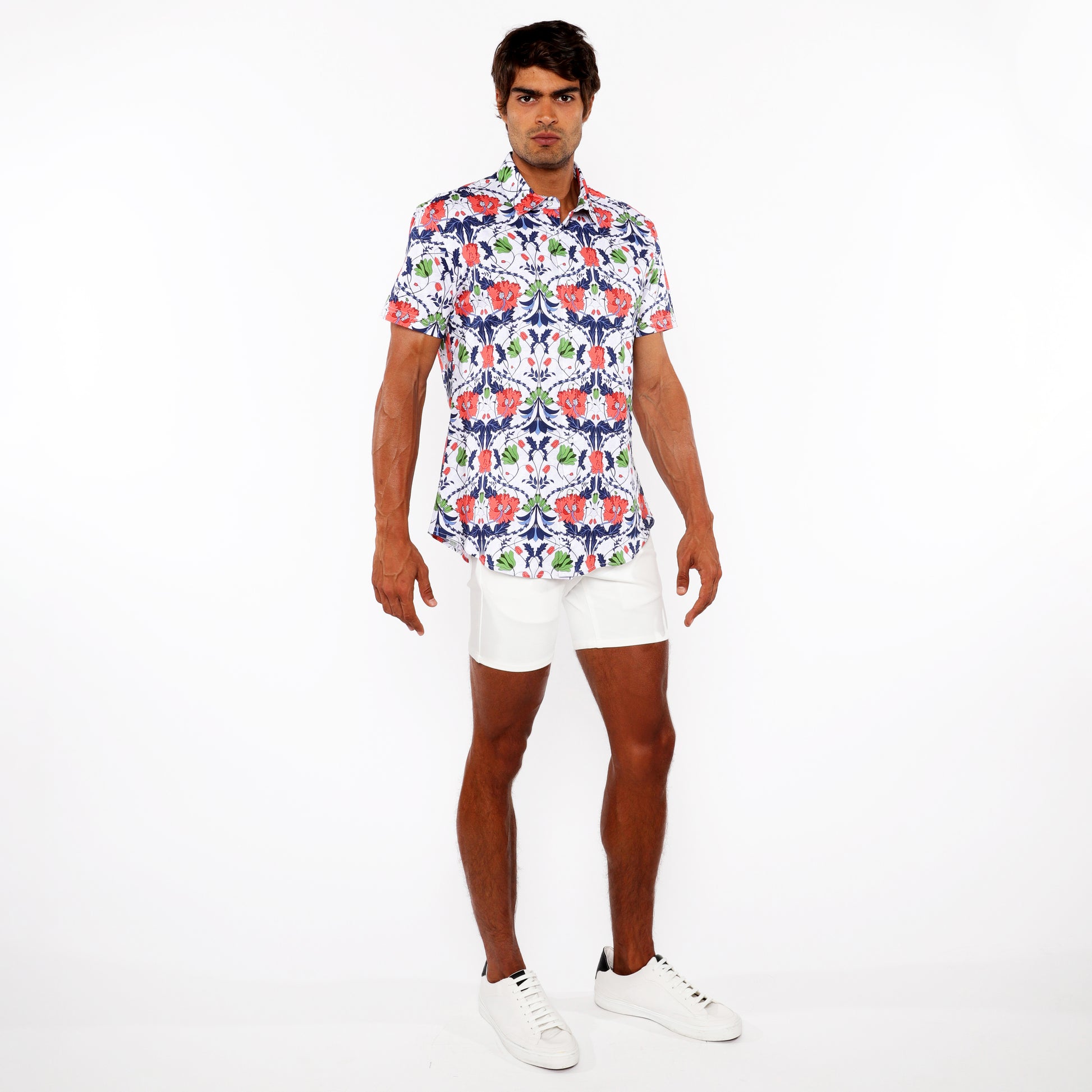 The intricate slate, sienna, green, and navy spiral floral vine pattern stands out against a white base, printed on ultra-soft 100% cotton jersey with natural stretch for comfort and flexibility. Carefully aligned across the placket and body, the print delivers a seamless, sophisticated finish.