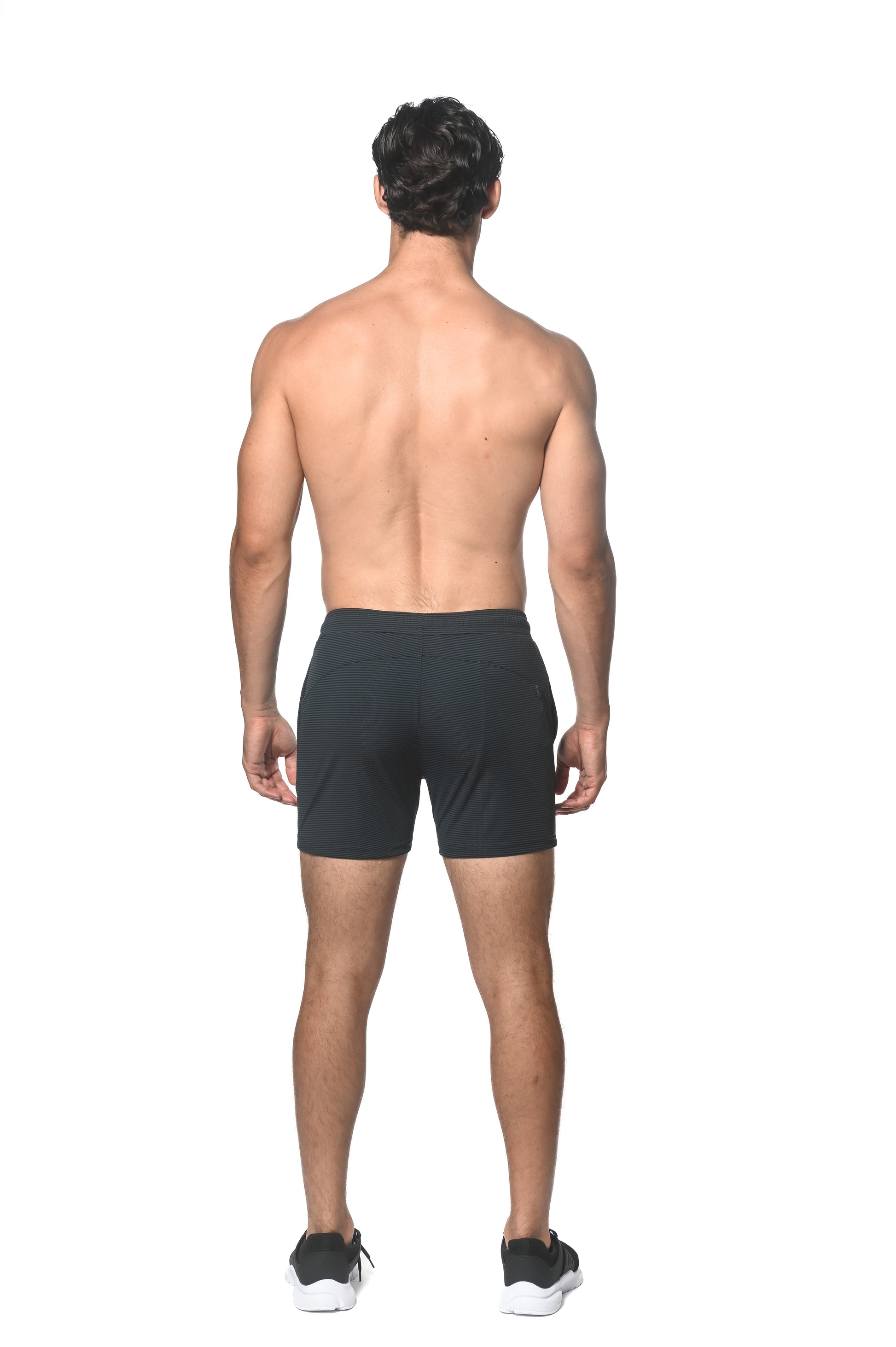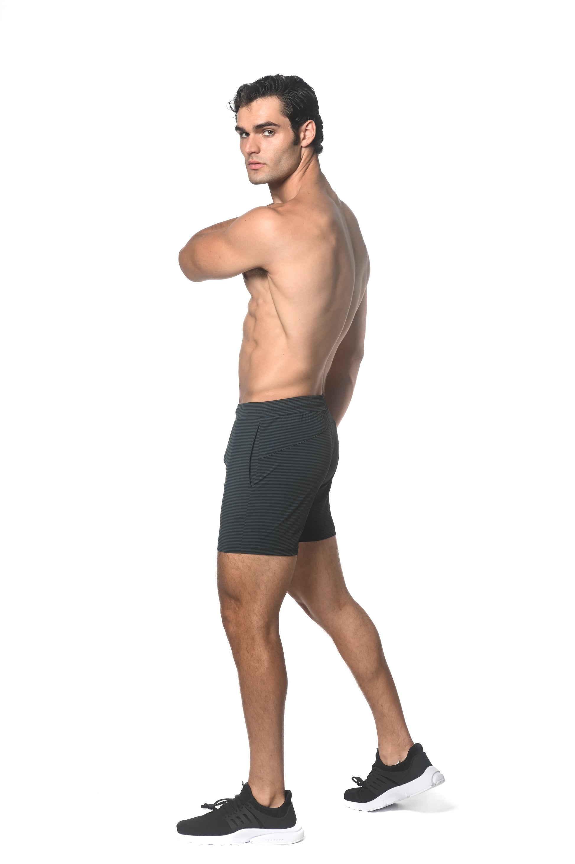 Pinstripe performance shorts with a tapered fit and shorter leg inseam for an enhanced, sleek silhouette. Features a relaxed elastic waistband with interior drawstring, two side pockets, a right-side back pocket with invisible zipper and a curved back yoke panel. Fabricated from a super soft, sweat-wicking, 4-way stretch textured mesh nylon elastane knit fabric for maximum performance and breathability. Inseam length is 6". Unlined.
