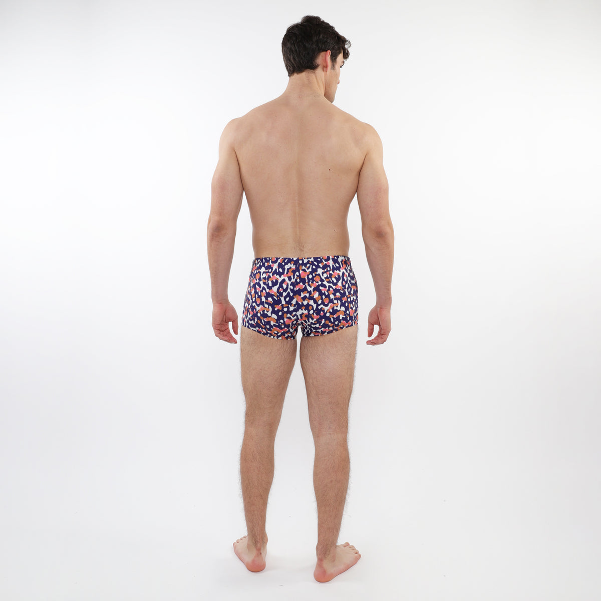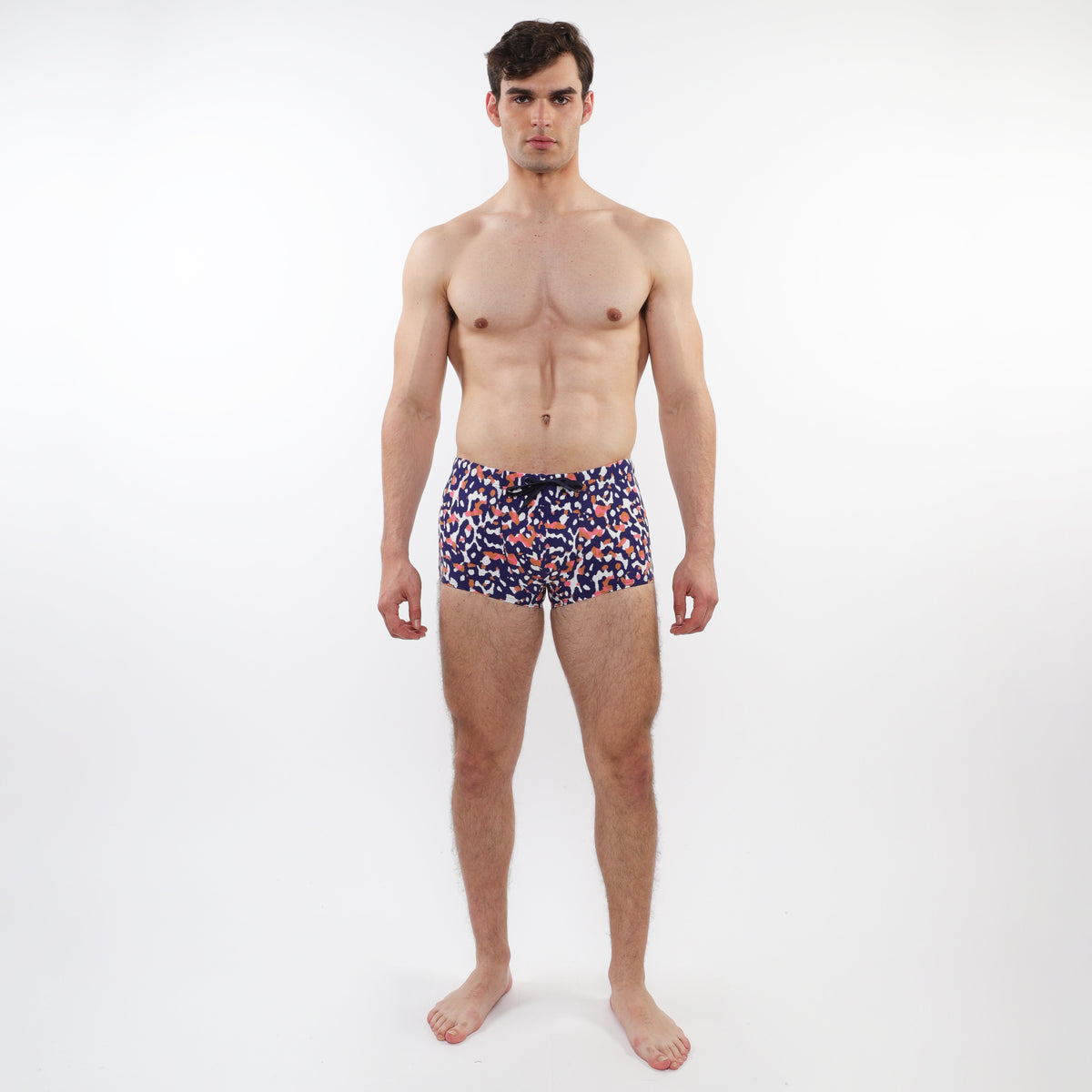 Classic low-rise printed swim trunks with front pouch lining, cut slim through the hips and thighs with a shorter 2" inseam for a sharp, tailored fit that enhances the legs and backside. Designed with our signature continuous self-fabric elastic waistband, a contoured pouch, and dyed-to-match drawcord with silicone aglets for a clean, functional finish.