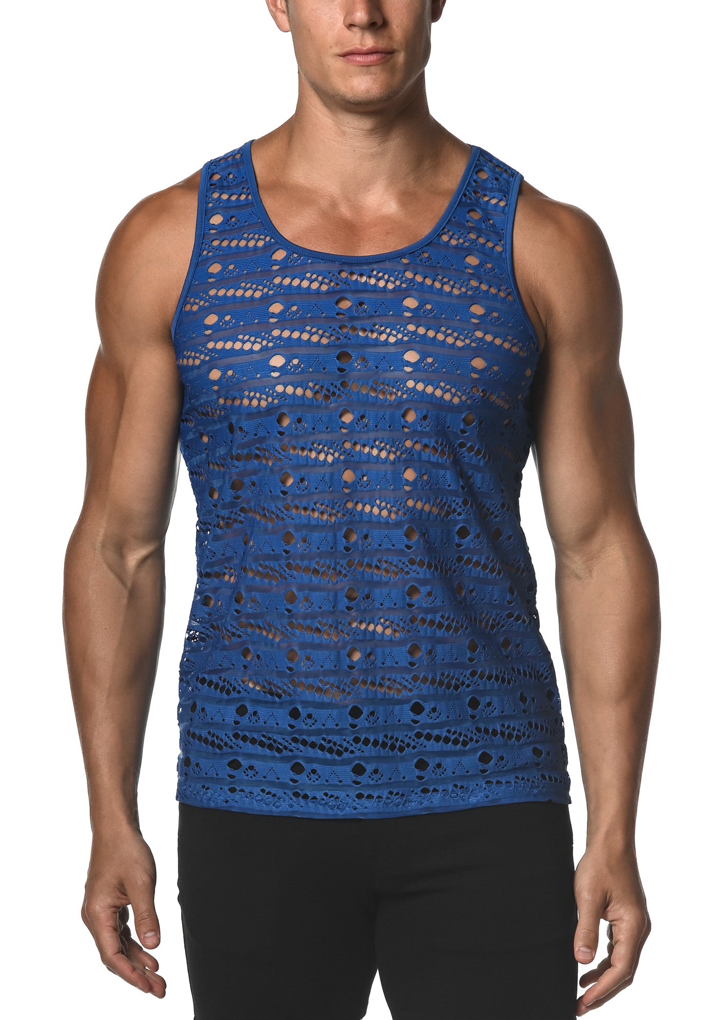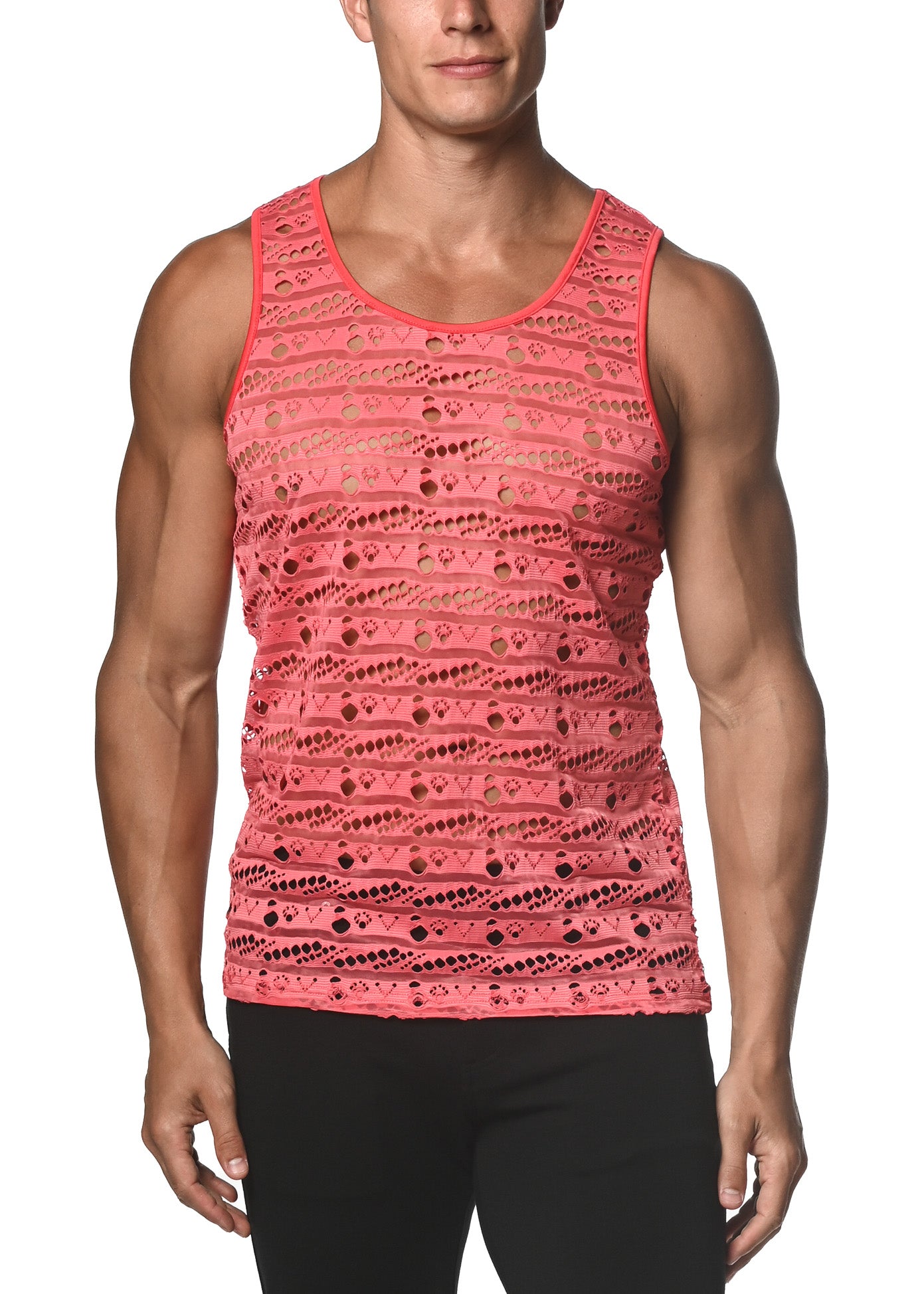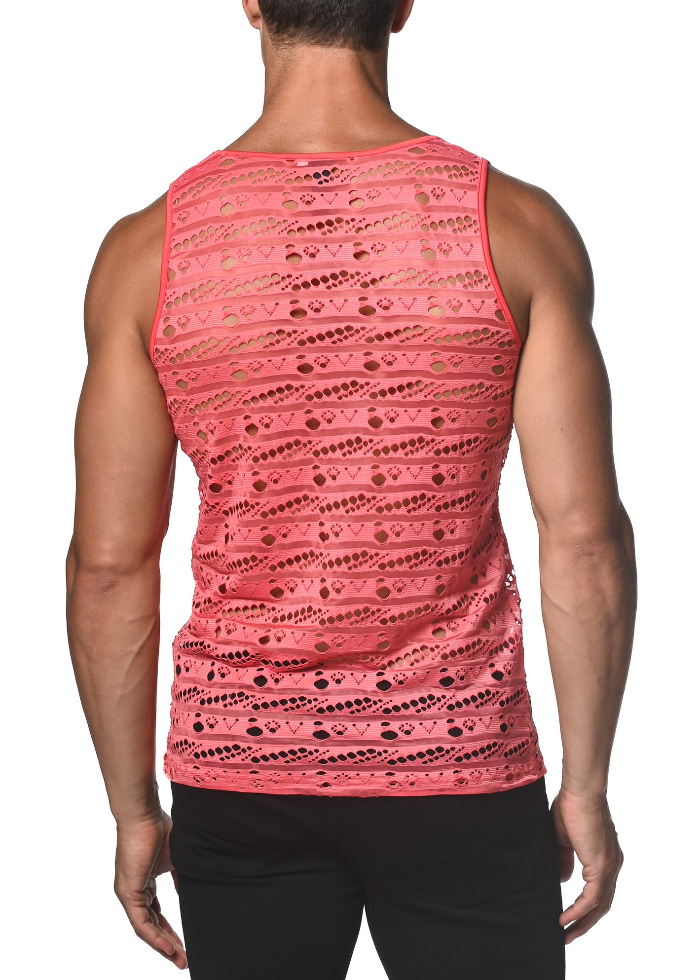 All-over Dash Dot pattern gossamer lace stretch tank with a slightly tapered fit. Featuring a scoop neck, a sleeveless design, a straight hem and contrast binding. Made from a super lightweight gossamer lace fabric with a hint of stretch for maximum comfort. Delicate fabric care.