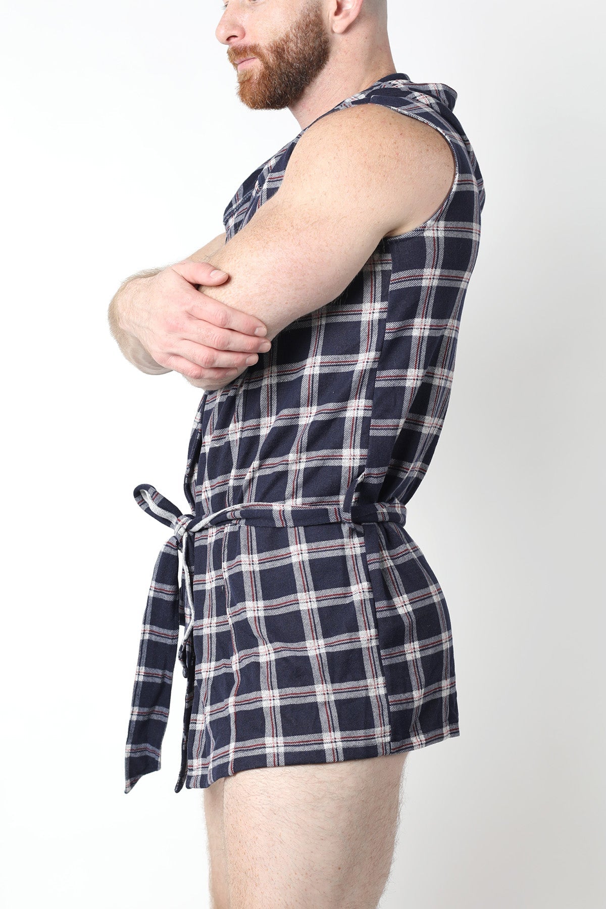 - FEATURES: PLAID PRINT, OPEN FRONT WITH TIE CLOSURE, CHEST AND SIDE POCKETS