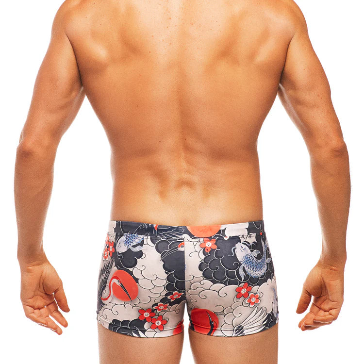 The Yakuza Swim Short draws its inspiration from the legend of the koi, a timeless symbol of ambition, resilience, and success in Japanese culture. Featuring an intricate Japanese tattoo-inspired print, this piece is a wearable work of art, celebrating the strength of those who rise against the odds. The cranes, koi fish, and watercolor motifs reflect the determination to push forward and transform.