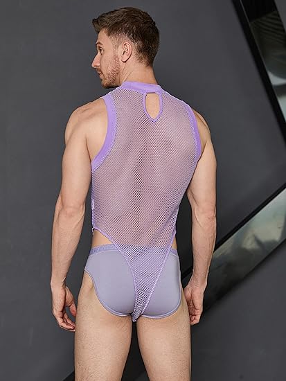 - Features: mesh, sheer, fishnet, stand collar, sleeveless, solid color, mens mesh top
